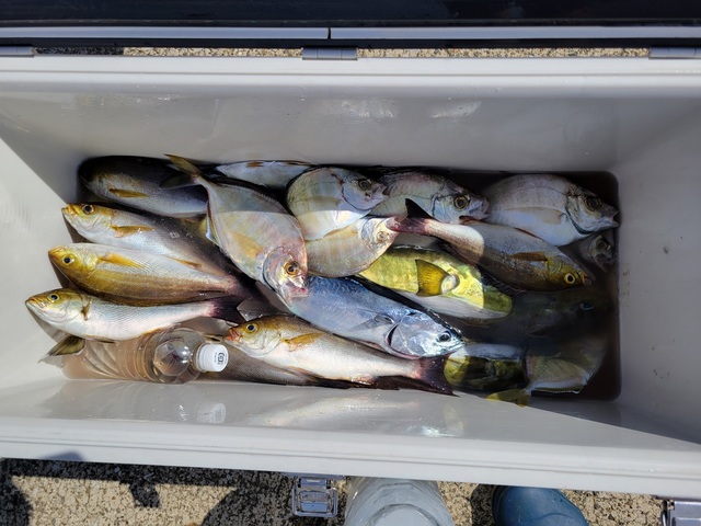 (マサバ)合計8匹 イナダ 35~42cm 0~2匹 シロアマダイ 50cm クロダイ 35~43cm 合計2匹 イトヨリ 合計6匹 イシモチ 40cm カイワリ オオモンハタ ハタ サバ 10月5日、かりゆし丸2号船本日の釣果です。 本日は五目で出船しました。天候晴れ、風は北~南潮は東~西。 イナダ35cm~42cm 0~2、 シロアマダイ50cmでました。 クロダイ35cm~43cm 船中2匹、サバ、船中8匹 イトヨリ船中6匹、 イシモチ40㎝、カイワリ、大モンハタ、ハタなどが釣れました。