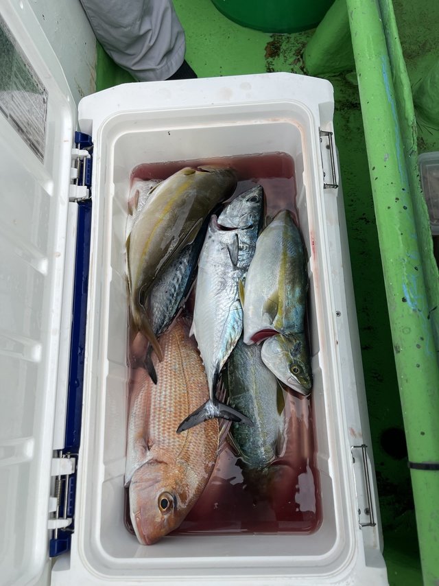 30~32cm 合計2匹 イナダ 34~42cm 1~8匹 ショゴ 34cm 合計1匹 マダイ 1.00kg 合計1匹 ニベ 42cm 合計1匹 本日もご乗船頂きありがとうございました^o^今日はLT五目で出船しました。台風のウネリありやりづらい感じでした。今日も西へ→なかなか難しい釣りでしたね!0の方はいなかったですが全然ダメで最後に小サバ、小アジ等狙い、その中にイナダ、ショゴ混じりましたが終了時間となり帰港しました。またお越し下さい☆水曜日、金曜日ショートルアーまだ空きありますのでチャレンジャーお待ちしてます♪土曜日はLT五目空きありますのでチャレンジャーお待ちしてます♪日曜日はアマダイで出船しますチャレンジャーお待ちしてます♪