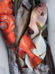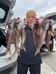 (クロシビカマス)クロムツ アジ サバ イサキ メジナ カサゴ マダイ 始めから美味しい高級魚・・・(魚の定食では結構いい値です)多点掛け入れ食いでした。型もまずまずで長い時間釣れて5人全員クーラーいっぱい(^^♪ですが、今日は黒ムツが少なめでした。他アジ・スミヤキ・さば。後半のコマセ五目は、イサキ好調に釣れ、他マダイ小型ながら船中7匹・メジナ・カサゴ・アジ等イサキだけ狙えば数釣れますがいっぱい釣れ過ぎていたので・・・。今日もお客様からイサキのおかず頂きました。