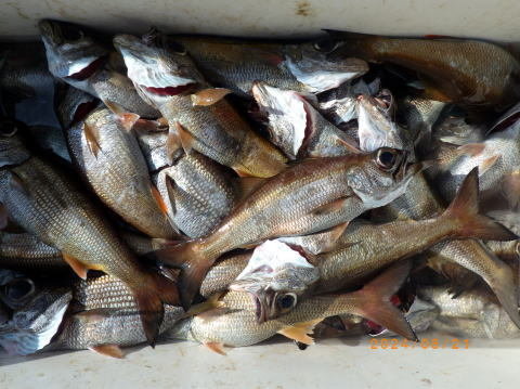 今日も朝一はフラッシャーサビキ黒むつ五目へ。今日はほとんどクロシビカマスの被害は無く、快適でしたね(昨日被害に遭われた皆様、大変でした(ペコリ)) 今日もおったで〜!2匹釣れれば満足サイズのデカムツ君が!! 黒むつはデカムツ混じりでトップ8匹。2番手7匹。他にメダイ、ハチビキ、アジ、サバ、他の魚などで今日もお土産グーバッチに!(^。^)! エード!エエドー!!(笑) 後半の泳がせ五目は短時間になってしまいましたが、良型含むヒラメ数枚、良型カサゴ数匹など。 本日はご乗船ありがとうございました。またよろしくお願いします。 午後船はファミリーフィッシングへ。 ほな、。