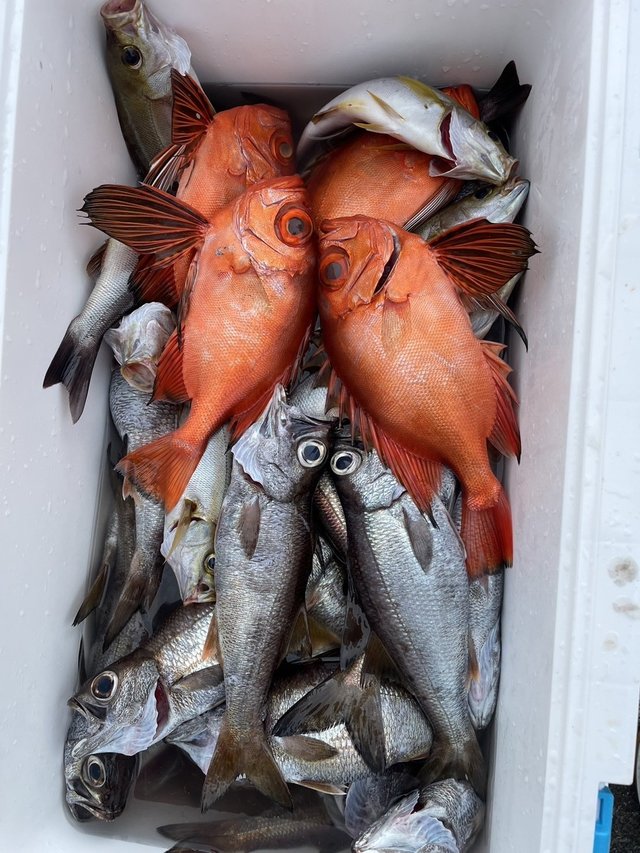 (クロシビカマス)3~7匹 クロムツ 2~3匹 サバ キンメ 0~1匹 どおも、優神丸です。 シケ休みですね〜。 そして軽くぎっくり腰ですね〜。 最悪ですね〜。 それでも俺は色々とね。 第2優神丸がジギングにて。 中深海ではありません。 潮が暗くて空も暗い。 なので、水深115メートルで御覧の魚たちが。 ルアーのお客さんだけでした。 シケ明け、海の中どお変わりますかね?? 良い海になりますように。