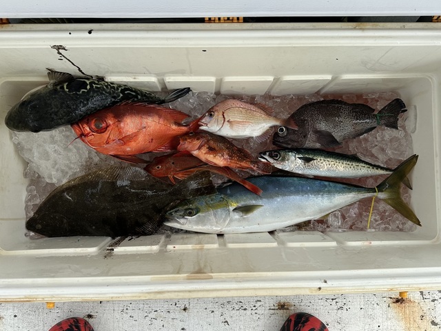 (クロソイ)40cm 合計1匹 イナダ 2.50kg 合計1匹 カサゴ 20~27cm 0~2匹 サバ 35~40cm 1~3匹 ヒラメ 2.80kg 合計1匹 チカメキントキ 40cm 合計1匹 トラフグ 50cm 合計1匹 ホウボウ 35cm 合計1匹 トラギス 20cm 合計1匹 午前ジギング船の釣果 潮無しで厳しい海でした キープ以外はリリースしました 大変お疲れ様でした