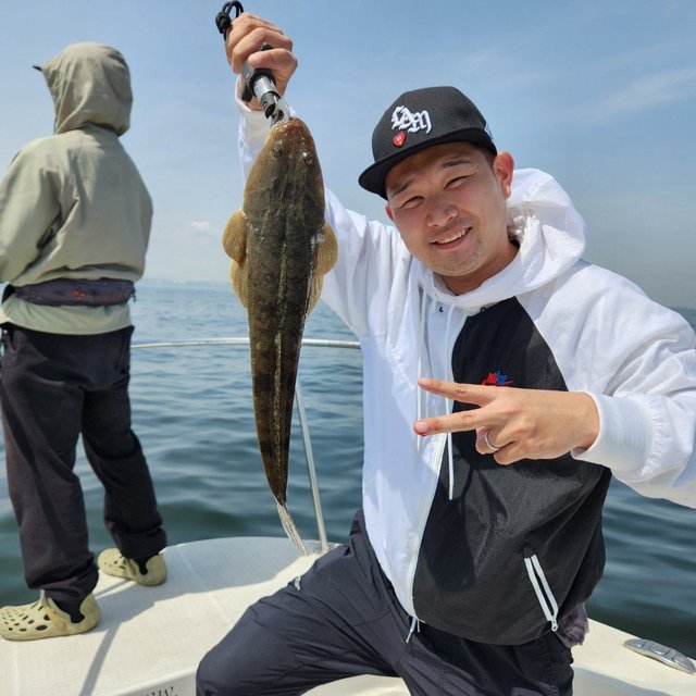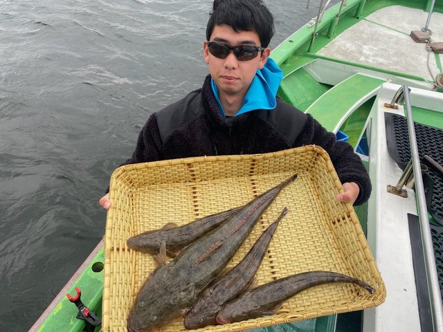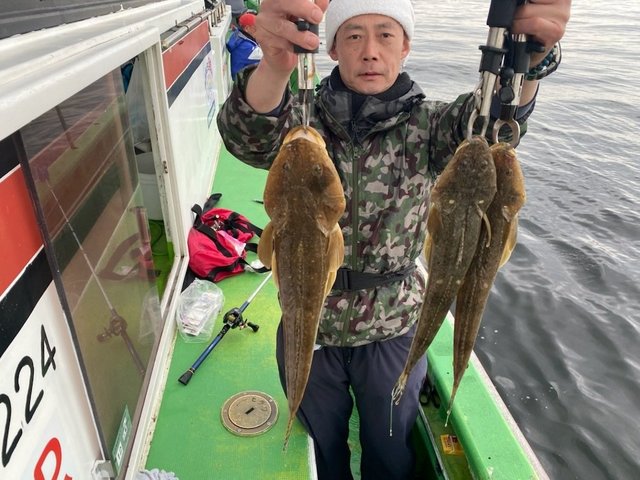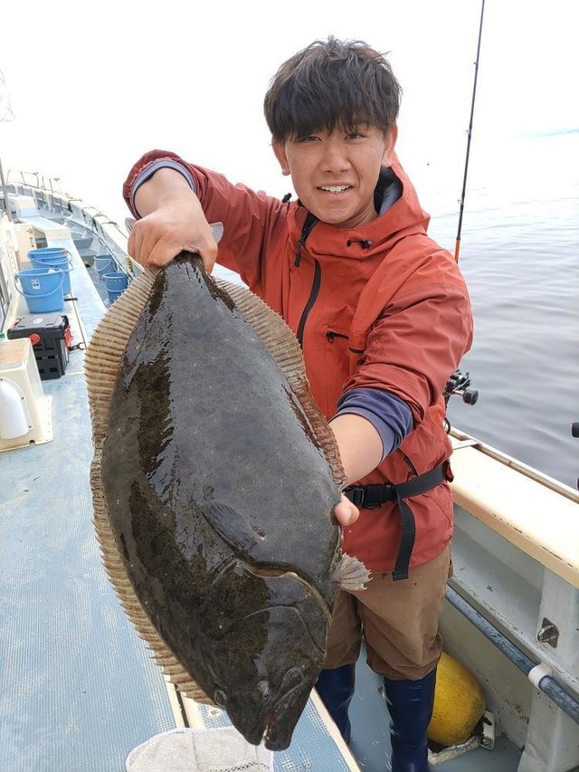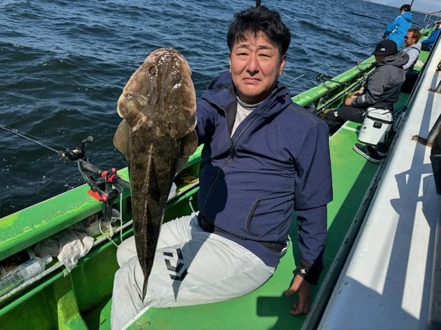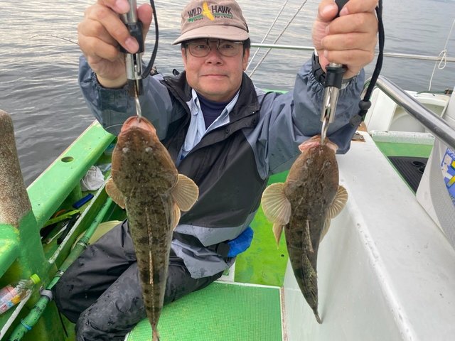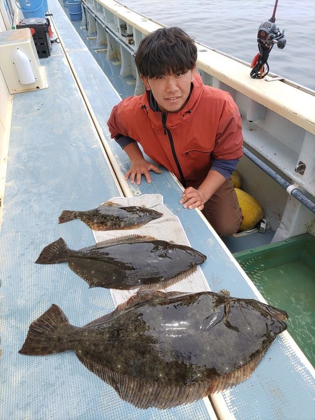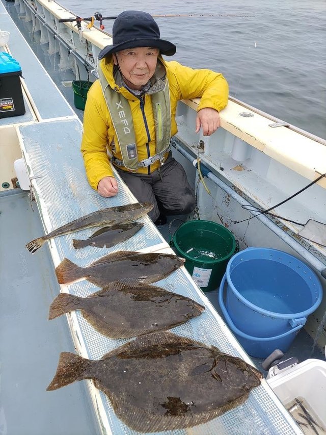 ヒラメ 0.50~1.00kg 0~4匹 トラフグ ワカシ ガンゾウ 朝から風強く海悪く船酔いの方も。皆様お疲れ様でした。明日もヒラメ船に出船します。