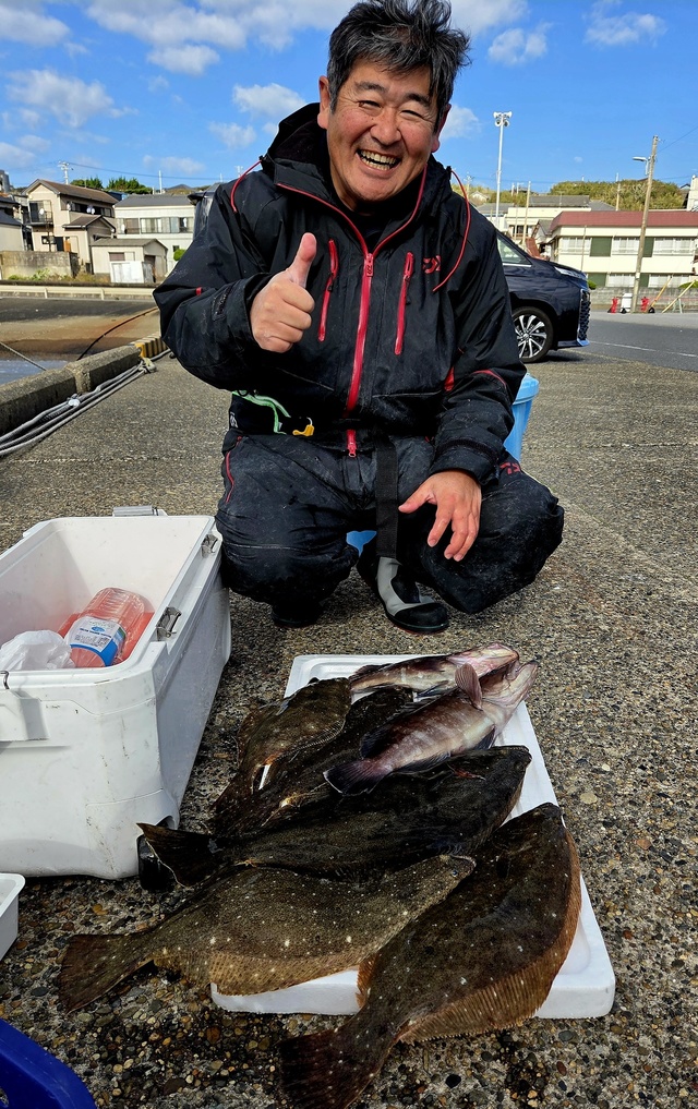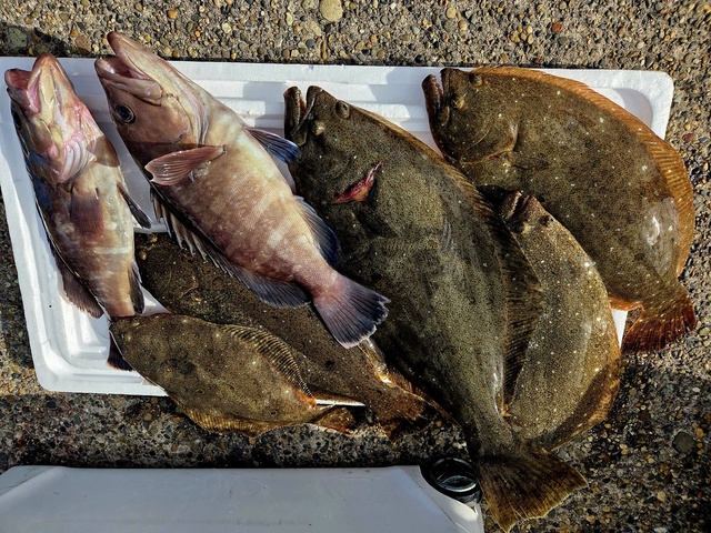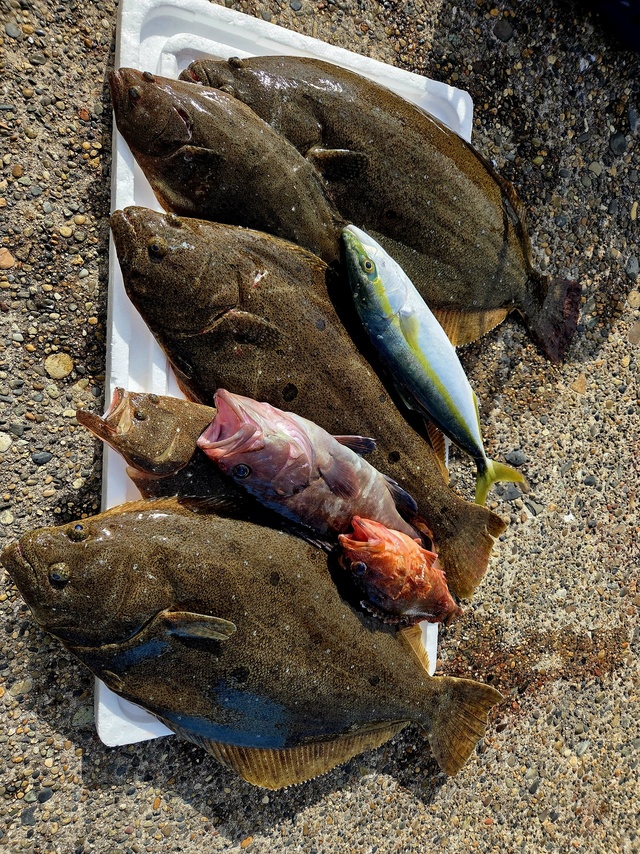 0.60~1.70kg 2~5匹 ヒラメ船、朝からポツリポツリと型が出ていた食べ頃の良型も混じりお客様全員釣れてお土産になりました。トップ5枚2名、他にカサゴ混じりました。今後はハナダイメインに出船致します、ご予約お早めにお願いします良型ハナダイ釣りに来てください。 ヒラメ狙いは要確認宜しくお願いします。