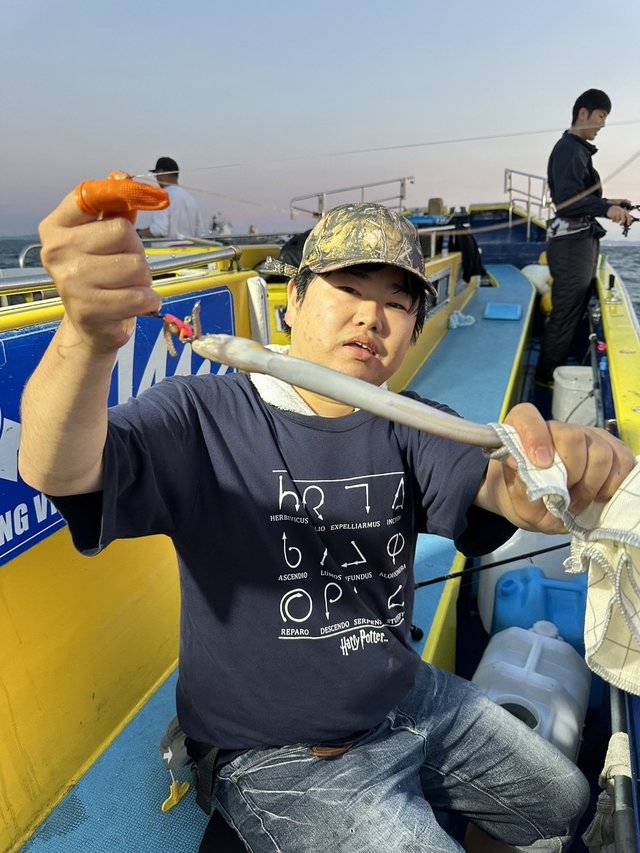 (マアナゴ)26~46cm 0~17匹 ヌタウナギ 竿頭5匹 ★夜アナゴ(第8)出てました‥ ……… アナゴ 26ー46㎝,0ー17本 ☆トップは加藤くん(^^)v (船中11人で58本) ‥‥ 晴れ,南西ー南東風そよそよ …… 毎年‥いつもやる木更津沖の.やや沖めの.まわりに‥ (水深は15ー17m)潮色は澄みぎみ,上げ潮は.やや速め. ‥‥ ‥うまくハマれず(^o^;)‥ …… ★最初にゲット(^o^)新井さん‥ 1ヶ所目‥まだ明るいのか‥間が.空きながら‥地味に.ポッン.(^o^).ポッン.と顔は見れて‥ →ちょい移動して‥暗くなりかけも‥地味に.ポッン.(^o^).ポッン.と‥ ‥暗くなり→ちょい移動して‥ちょいズラしーして‥ →ちょい移動して‥ちょいズラしーして‥我慢しても同じ様な.あたりで‥(^o^;)‥ ‥‥ やや沖めに→移動して‥ ちょい移動して‥ 帰りまで‥同じ様なカンジで‥地味に.ポッン.(^o^).ポッン.と‥でした. ‥‥ (サイズは‥この時期に.しては.まぁまぁってカンジ) ‥やや小ぶりは釣れたが‥えんぴつサイズの.めそっこは.釣れなかった ‥‥ 赤クラゲ.ハンパに.いました(-_-;)‥イカリのロープはヌルヌル状態‥ ‥‥ ヌタウナギも.ハンパに.いました(-_-;) ヌタの‥トップは5匹(^_^;)Y根さん …… ‥21時15分に沖上がりして‥ 22時過ぎ‥そのままま水門の中に‥ …… お付き合いしてくれた.お客様ありがとうございました