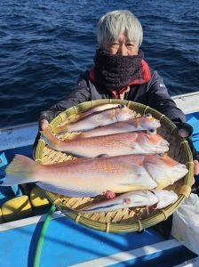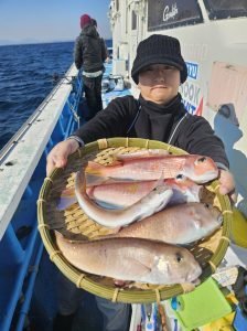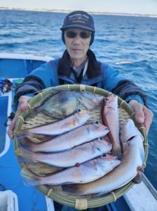 アマダイ 26~42cm 0~5匹 トラフグ サワラ イトヨリ 中型主体◎ 本日も大勢のお客様にご乗船いただきありがとうございましたm(__)m 心配していた南西風が吹き込み30分ほど早上がりでしたが、殆どの時間ナギでやれた1日でした。 浅場はやはりサバフグの猛攻激しく深場のポイントへ、潮流れずでこまめに周り変えると何処でも顔を出してくれました。 中型主体に良型混じり、最大は42㎝でした! 明日は朝まで風が吹きっぱなしの予報なので海悪いと判断し出船中止とします。