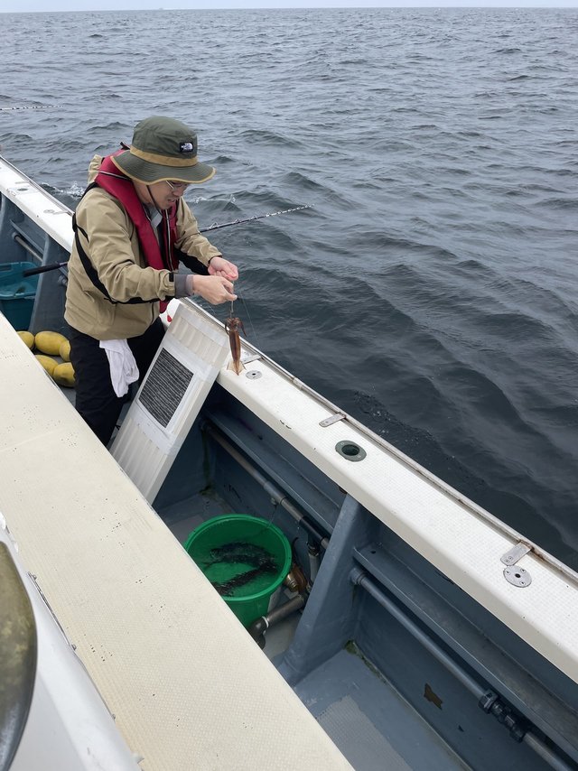 ヤリイカ船です。南西風有り釣りづらく、巻き上げ中のバレも多く単発であがってくるのが多くなり釣果のびず。大型ヤリイカ多かったです。