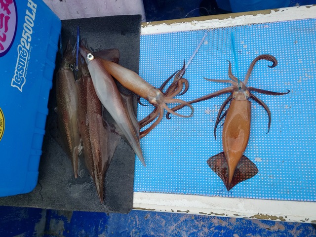 0匹以上 アカイカ 本日も、たくさんのお客様にお集まり頂きありがとうございます。 0尾~ツ抜けならず...良型赤イカあがりました。 皆さん、期待を込めてお集まりいただきましたが、船長、良い反応に当てられず、2枚潮とサバの攻撃もあり、大苦戦となってしまいました スミマセン・・・ 明日もヤリイカ狙いで出船で、受付終了となってます。