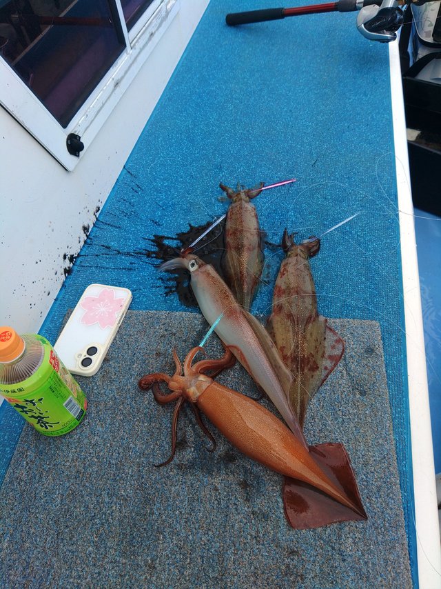35~47cm 2~18匹 ヤリイカに出船。相模灘イカの海になりつつ;;;;;ポイントは城ヶ島西沖へ。潮色がかなりの濁り。。前日とはまるで環境が変わっているらしく、崖周りからちょい浅場の135mでヤリイカとスルメのコラボで3連かけ。この反応を追いかけて入れれば。。。。流れがそれにしても速く。ここから南のポイントに。反応の探しても見つからず、また北上してヤリイカ3連かけ、そしてまた南側で群れ発見の情報をいただきまた南下。これが時間的にもラストチャンス。城ヶ島沖の東側の黒ムツ船は流れが縦から横になり始めたと。この崖っぷちで船内乗り始めました。おおおおー多点掛けの始まりー。船首ではMakeByMr.BOoのスッテがいい仕事しているようです。すると潮が縦から横に流れ始めました。この流しには船首直結仕掛けが着底前に仕掛けがふわふわするほど活性が高く!5連かけ!7連かけ!船内やんややんや!!一年ぶりにヤリイカ釣りをする方も一杯バラシの4連掛けなど船内大喜びでした。火曜にご予約お待ちしております。8;動画多いです