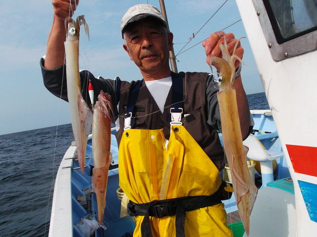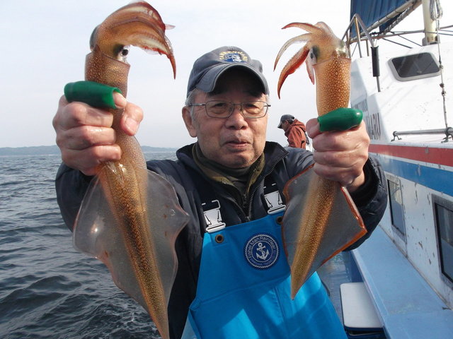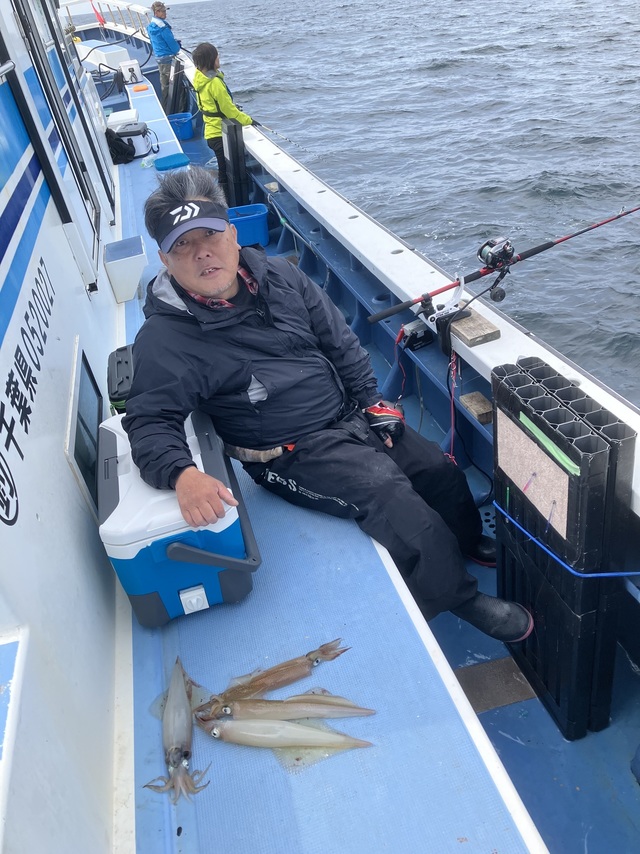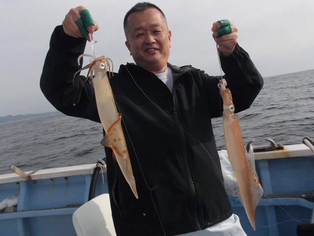 23~40cm 2~17匹 6時30分出船朝から洲崎沖でスルメイカに良型のヤリイカは交じって午前中ボツボツ釣れました。竿頭は3名岡本さん他2名プラ角11センチヤリイカの場合はオモリ120号