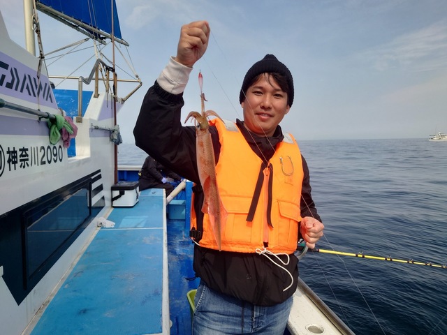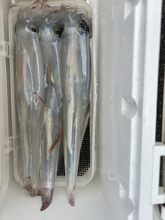 25~40cm 1~14匹 本日は通常出船できました。 ヤリイカシーズン開幕からしばらく城ヶ島西沖~剣崎沖狙いが続いていましたが急展開です。 昨日の後半に好況だった洲崎沖向け直行してみました。 潮流はまさかの北西潮、何やらエサ交じり、サバ交じりのような反応が見えていますが振るわず。 *(洲崎沖~沖ノ瀬では黒潮系の潮流の影響が強いのでほとんどが東系の流れです) 南部エリアへ移動、ポツリポツリと乗り始め、多点掛け模様の飛び出す船もあり。 小振りサイズも混じりますが、盛期並の良型も混じり3杯掛けあり。 後半は尻すぼみで終了も、又見つけてみる価値は十分といった手応えでしたね。 横波もありアタリが上手く掴めなかったという皆さんも、後半はコツを掴んでくれて竿頭も。 身片だけというバラシ多数ながら、パーソナルベストという方もいました。 明日は沖ノ瀬方面も攻めますよ、状況が変わりましたので150号オモリをご用意下さい。