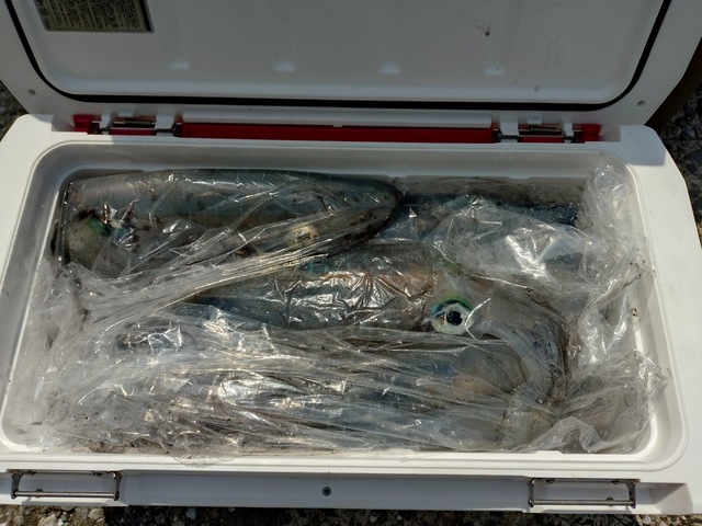 (カミナリイカ)2.50kg 合計1匹 アオリ 2.00kg 合計1匹 ティプランにでました。 潮濁ってダメでした。 最近近場でイナダ、ワラサがちょくちょく跳ねます。 沖はキハダマグロが結構跳ねます。