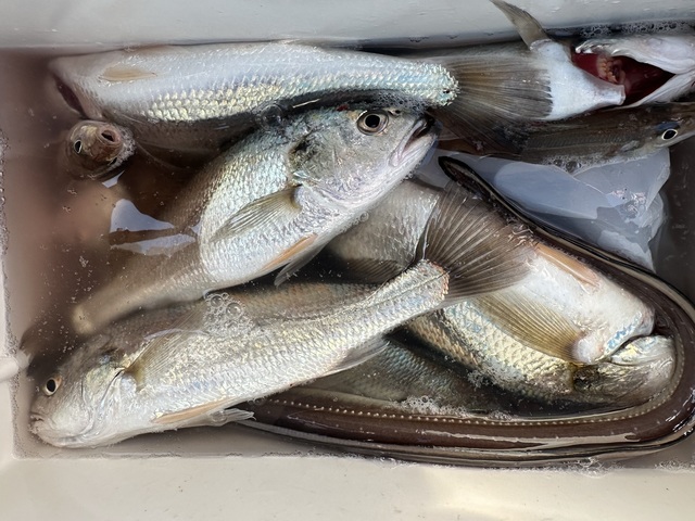 (マアジ)17~25cm 12~42匹 ◆午前アジ 初心者多数でしたが小、中交じりでポツリポツリ上がり他にカサゴ交じりました。 ◆午前イシモチ仕立 本日はファミリー仕立船で皆さん イシモチ10匹前後釣りアナゴも入り土産とれました。