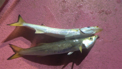 (アカカマス)アジ 5~23匹 サバ 6~22匹 ツバイソ 0~6匹 アカイカ 0~2匹 マダイ 最大1.00kg 合計2匹 スルメイカ マエソ 夜便アジ&イナダ釣り。いつも通りに深めのポイントに止めてみたが、どんどん浅くなって最後は15mほど水深が浅くなった。 深いポイントではサバが多かったが、浅くなるにつれサバは数が減り終盤になるにつれアジのアタリは増えた。 今日も深めのポイントではマダイが二枚混ざる。そしてカマスなども少し見えました。 アカイカは水深が浅くなってから姿が見えた。そしてアオリイカも水面に多数浮上していたが誰も餌木を持っていなかったので釣れませんでした。 夜釣りはだんだんと楽しい秋の海に変化しています。