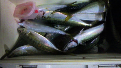 (アカカマス)アジ 5~18匹 イナダ 竿頭40匹 サバ 5~15匹 夜便アジ&イナダ釣り。前日同様に早い時間から猛ダッシュ。最初はアジが良く釣れていたが、途中からイナダの猛攻が始まる。 前日のサバの勢いは落ちたがその分イナダの活性はMaxでした。 サイズアップしてきたイナダは、フライにしても良いし、酢締めやナメロウ、タタキやシーチキンにしてもおいしいです。 しばらくこの勢いは続きそうですね。
