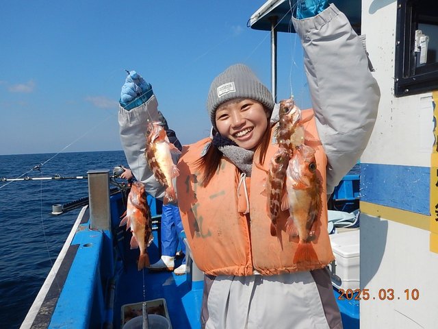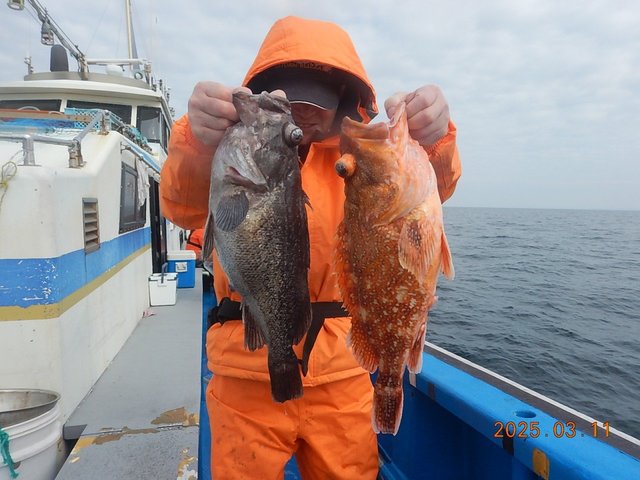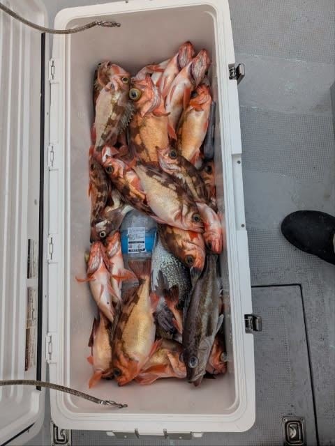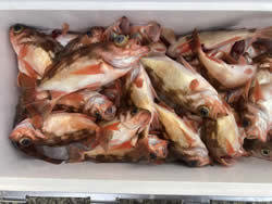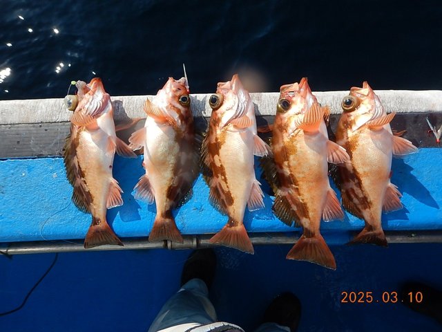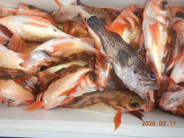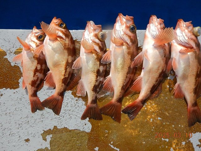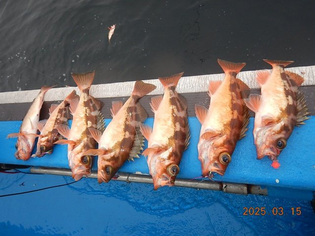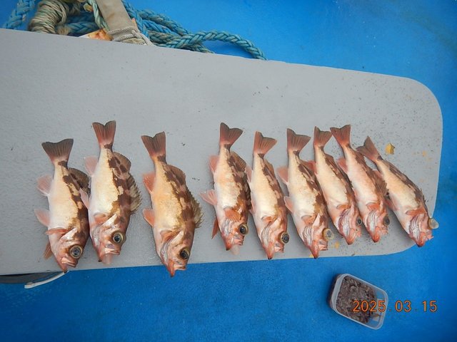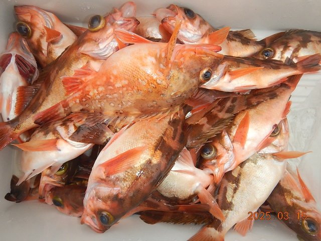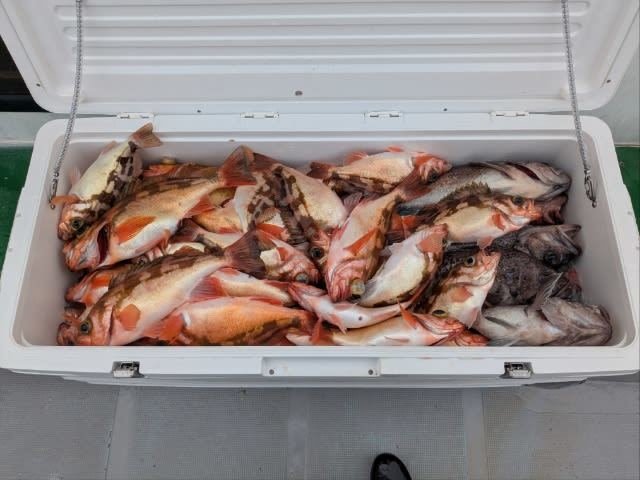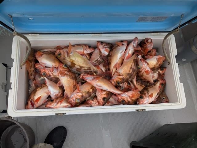 (ウスメバル)竿頭100匹 カサゴ 40cm チカメキントキ タヌキメバル シキシマハナダイ 今日は解禁後初の玄達瀬沖メバルで出船しました。心配していた潮もブッとびではなくイイ感じの潮、海上ベタ凪でした。1投目、2投目、と連で、10連パーフェクトもありましたが後が続かずでした。クーラーボックス満タン釣果でした。 お疲れ様でした。