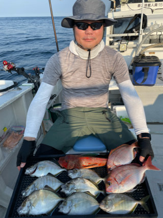 マダイ サバ アジ トラフグ ホウボウ 今日も行ってきました~ 今日は青物鳥山無し…(T_T) しんぺーが食いのいいサバ鳥山を発見で急行しました!! サバはバタバタ釣れてくれました!! マダイはまぁまぁな激流の中 結構いいかな?って思ってたのはバレちゃいましたが~ なんとか2枚顔見れました!!あとは小鯛とチダイでした。 アジはポツポツで大きいのも少ないですが、混ざってくれました!! タイは2枚とも三輪さん~ 大蔵さんと大堀さん、サバ~ アングラーズゆりちゃん、サバにアジ~ 浅野さん、アジ~ 大堀さんデカい!! ビール頂きました~ありがとうございます。m(__)m こんな感じでした~ ありがとうございました。m(__)m 明日も頑張ります!!今のところ、お客さん1名様でガラガラです。 応援よろしくお願いします。m(__)m