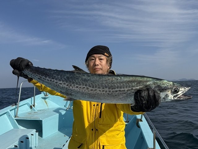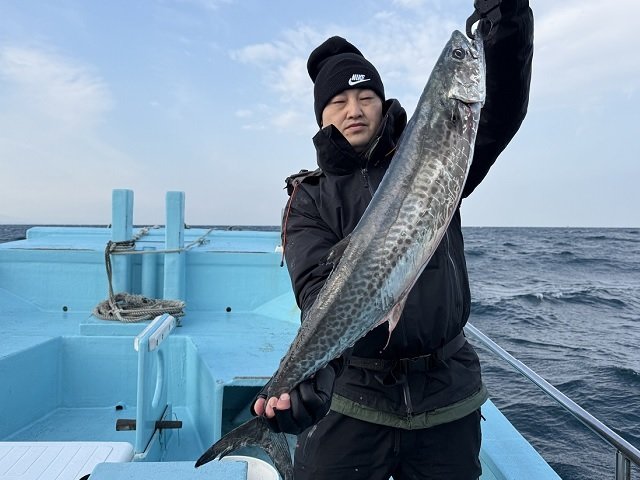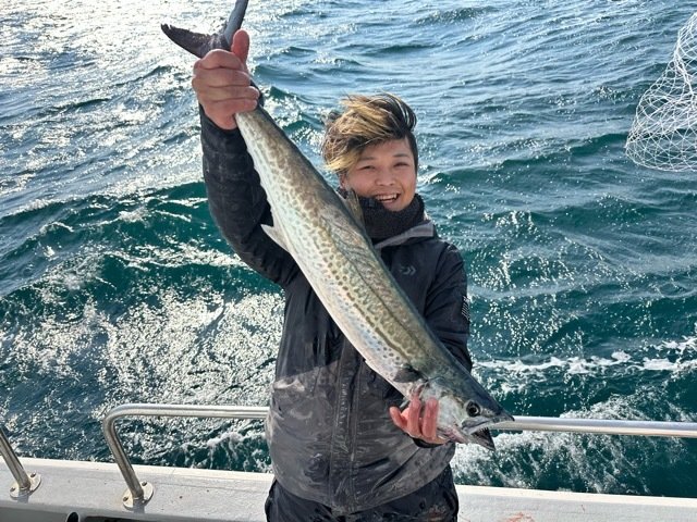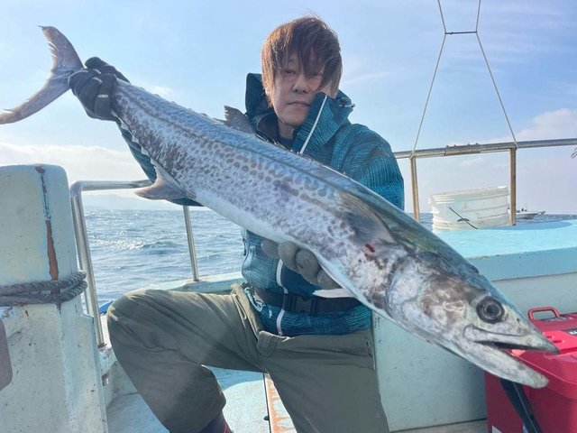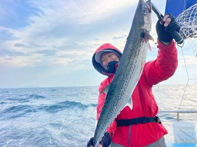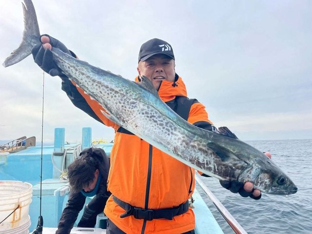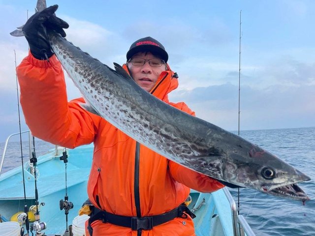 (サワラ)タチウオ 本日は太刀魚にて出船しました。港に集合しましたが予報以上に風があり、不安なお客様は帰っていただき、出船しました。風は強かったが上凪は思った以上に良く10分ほど流し、お客様に確認してスタート、前半ポツポツ、当たりは多かったがバラシが釣果と同じくらいありました(逆潮の影響)。後半ポッツポツ。餌釣りは14本。ジギングは23本~9本・F4.5~F2.5・F3.0主体。サゴシ混じる。ジギングトップは御前崎市の小田原カレン様(輝風丸)。
