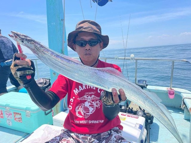 (アカカマス)イシモチ マゴチ ホウボウ ソウダカツオ サバフグ サバ アジ タチウオ 合計3匹 サワラ 行って来ました。 昨日は組合業務でお休み。 1日遅れてジギングバトルの初日です。 とりあえず、エントリータチウオ釣れました。 アオモノも狙ったけど サワラ釣れて何発か切られて…だね。 こんな感じで ありがとうございました! サワラ80センチ・ タチウオ指3半まで3匹・ アジ・サバ・カマス・さばふぐ・ やっぱら・ホウボウ・マゴチ・いしもち。
