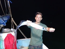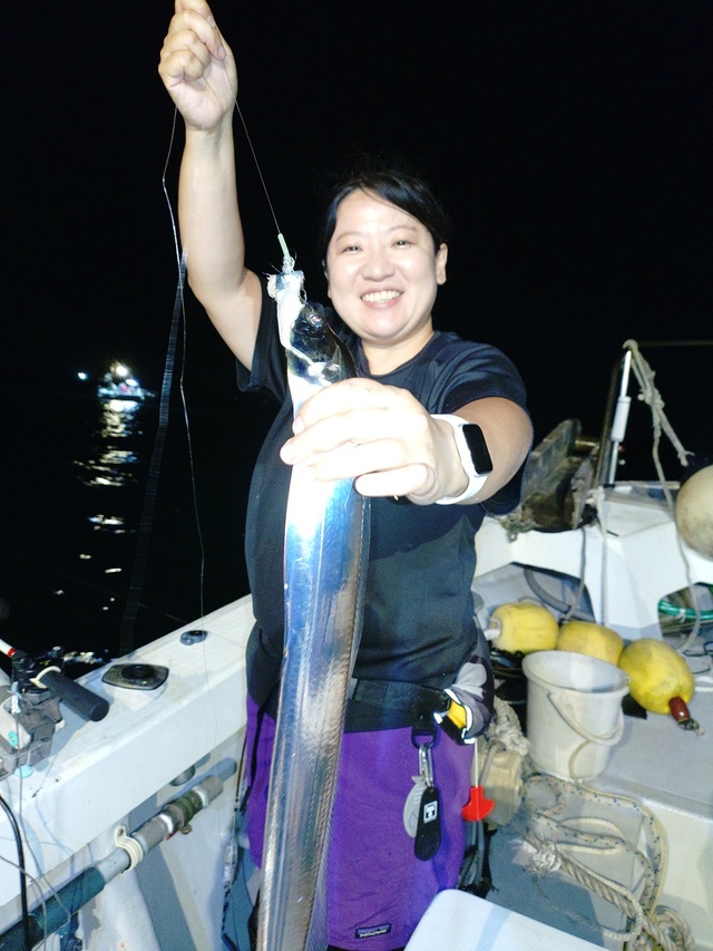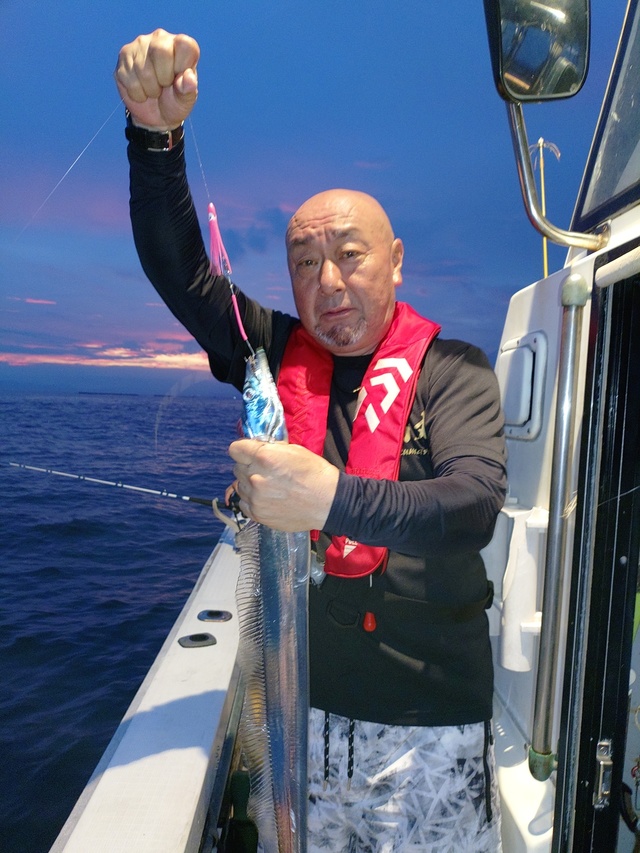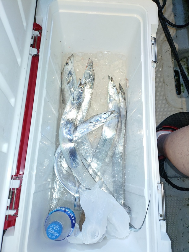 タチウオ 竿頭9匹 前半、横波でグラグラして釣りにくかったが、後半風が変わって凪良くなってから、少しアタリが出て太刀魚釣りになりました。なぜか厳しい釣りになりました。アカカマス混ざりました。 3番竿5本。サイズ、3本半指-2本半cm。夜釣り。