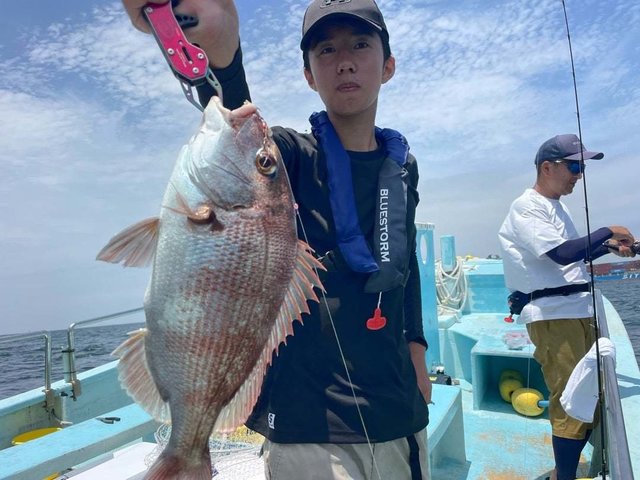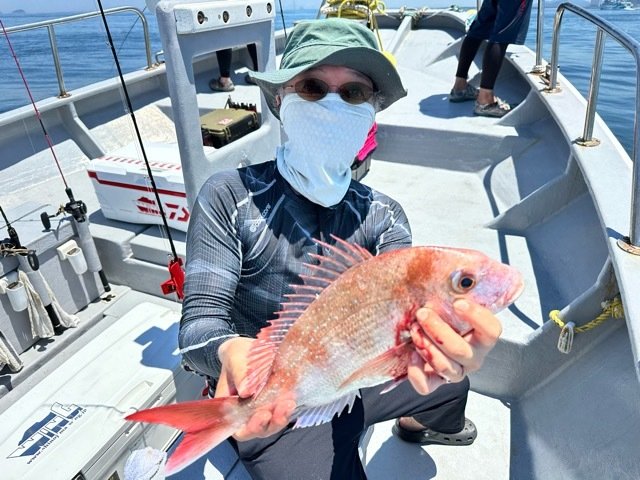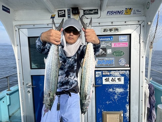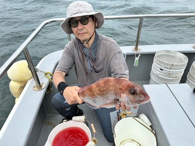(アカカマス)マダイ 最大45cm ニベ 最大60cm アジ イサキ サバ ムツ ツバス 5時50分〜12時までタテ釣りで大物狙いです。1号船です。 ポイント石鏡沖 仕掛太サビキの7本針、ハリス8号オモリ60号エサ小魚 奈良の森中氏ら3名の釣果 マダイ45cm ニベ60cm その他アジ、イサキ、カマス、小サバ、ムツ、ツバス 南の風が涼しく吹いて涼しく釣りができました。 沖からのうねり、波もありましたね。 ベイトは多くありましたが、大物のアタリが少なく釣果もイマイ