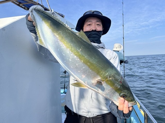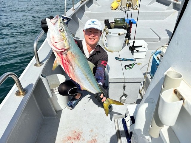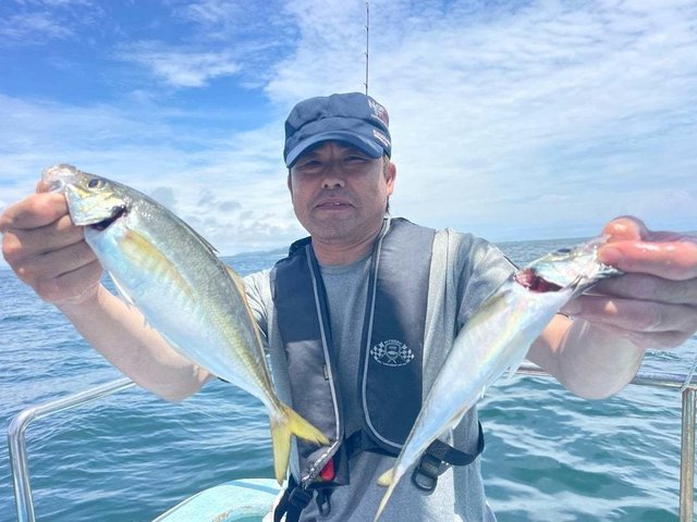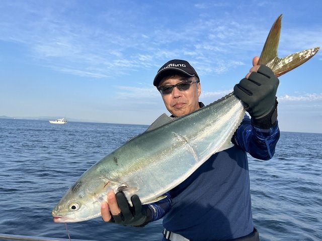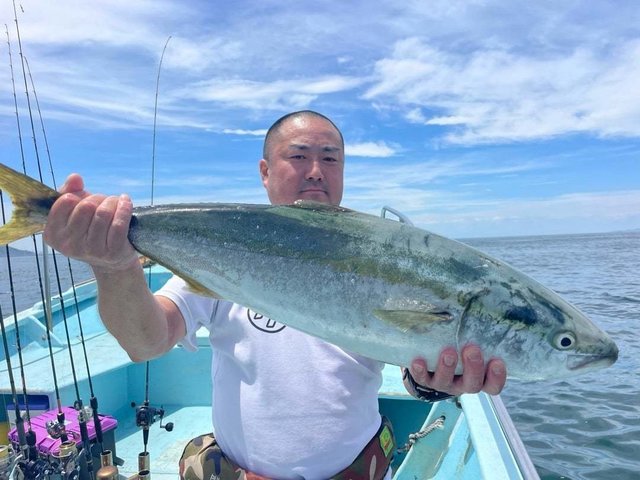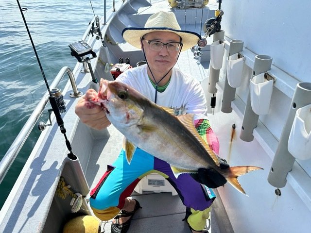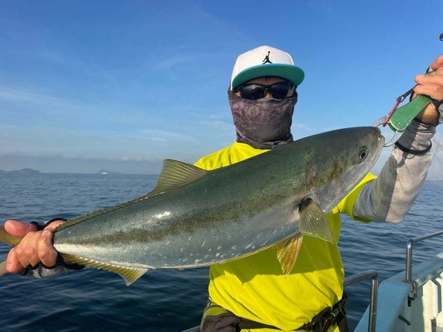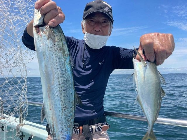 2号船午前便タテ釣り 5:30〜12:30までタテ釣り ポイント石鏡沖 仕掛け太サビキの7本針、ハリス8号オモリ60号 マダイ50㎝1枚 ヒラメ58㎝1枚 ツバス40㎝4〜5本 その他、スマガツオ、カマス、イサキ、アジ 今日も暑い日でしたねベイト反応ありですがイワシが付いたら付かなかったりで難しそうでしたね、イワシ付くとツバスが食ってくる見たいな感じでした。