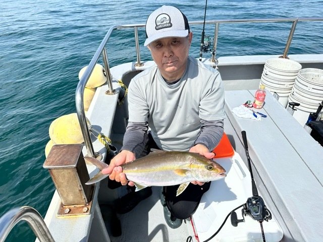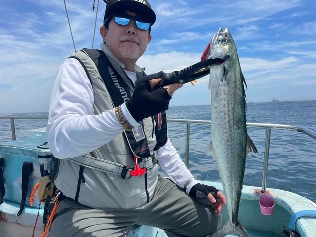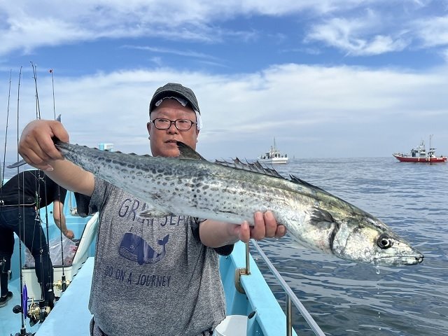 (アカカマス)ヒラメ 最大45cm 合計1匹 アジ カサゴ ムツ 1号船午前便タテ釣りです。 5時50分〜12時までタテ釣りで大物狙いです。1号船です。 南の風が吹いて波もありました。 イワシのベイト反応もチラホラとありましたが、群れが小さいのかすぐに動いてしまいサビキの付きも悪かったですね。 小アジ、カマスはよくかかってきましたが、大物のアタリが少なくて釣果も伸びなかったです。 ヒラメ45cmが1枚 その他アジ、カマス、カサゴ、ムツでした。