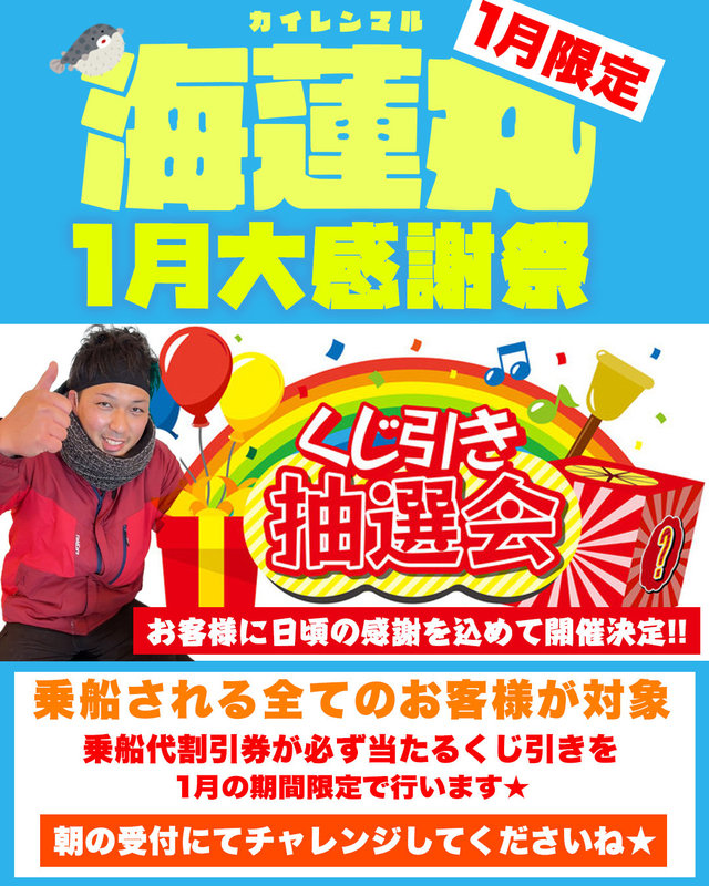22~55cm 合計40匹 本日29日は今年の出船最終日でした。今年最後の投稿は、各船の船長からのご挨拶です。ぜひ動画を最後まで見てください。 本年も海蓮丸をご利用いただき、 本当に本当にありがとうございました。 今年もたくさんのお客様と海に出て、笑顔や感動の瞬間を共有できたこと、心より感謝しております。 船釣りの醍醐味は、海に出て自然と向き合い、何が起こるかわからないワクワク感。魚が掛かった瞬間の喜びはもちろん、相手は大自然。思い通りにいかない日もあります。 それでも、その時間さえ「楽しかった」と思っていただける場所でありたい。それが私たち海蓮丸の想いです。釣果だけではなく、心からリラックスできて、笑顔があふれるひとときを大切にしています。たとえ厳しい状況の日でも、船上が笑い声で満たされるよう、全力でサポートいたします。 初心者の方からベテランの方まで、どなたでも安心して楽しめるよう、丁寧なアドバイスと温かいおもてなしを心がけています。 「海蓮丸を選んで良かった」と思っていただけるよう、釣りだけでなく、人とのつながりも大切にしています。 船釣りは、みんなで同じ時間を共有するからこそ、特別な思い出になるもの。来年も素晴らしい釣果と、たくさんの笑顔をお届けできるよう、スタッフ一同全力で頑張ります。 初釣りは【1月5日】から出船予定です。 1月のご予約も埋まってきております。1月からは初の試みとしてフグ釣り1日便が毎日始まります。1日便での最高記録は12月、一人41匹釣られたお客様がおられました。 来年も海蓮丸でお会いしましょう。 皆さまに、今年最後のお知らせです。← 【重大発表】 1月に海蓮丸大感謝祭を開催いたします。 日頃のご愛顧への感謝を込めて、開催が決定しました。 乗船されるすべてのお客様が対象となります。 当日は朝の受付にて、 お一人様につきクジを1枚お引きください。 次回ご利用いただける 乗船代割引券が必ず当たります。 中には ・乗船代無料券 ・乗船代半額券 もご用意しております。 1月も海蓮丸をどうぞよろしくお願いいたします。 それでは皆さま、良いお年をお迎えください。 https://www.instagram.com/p/DS2BYAdEd-x/