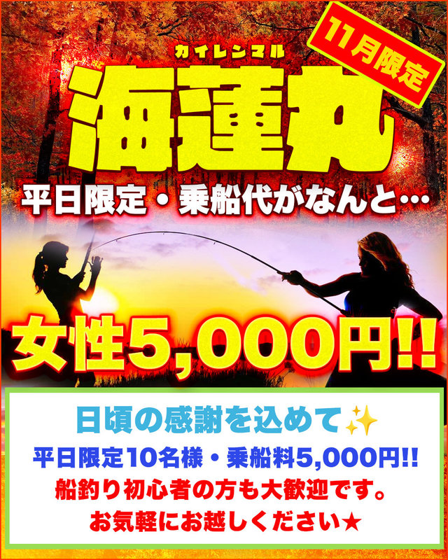 22~53cm 合計47匹 真鯛好調、一つテンヤでツヌケもあり。真鯛だけで船中50近く釣れていました。石鯛や50㎝クラスのアコウまで釣れています。一つテンヤ絶好調です。 カワハギ便も今日は絶好調、ツヌケしています。 全体58枚、大型も混じりました。今からスタート、といった感じですね。 アオリイカは今日は難しかったです、、 何故かなかなか口を使ってくれませんでした。。 明日に期待ですね。引き続きよろしくお願いいたします!!! ■11月は女性平日5000円です、11月限定です。 ■毎週水曜日はイカ1日便でます!! 詳しくは画像一番右にスライド もっと詳しくは海蓮丸のSNS(インスタグラム他)をチェックお願いいたします!!! 11月2日・3日全て満船です。 5日はまだ全便空きございます★ よろしくお願いいたします。