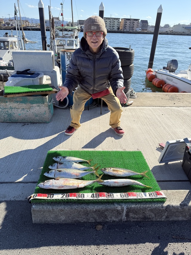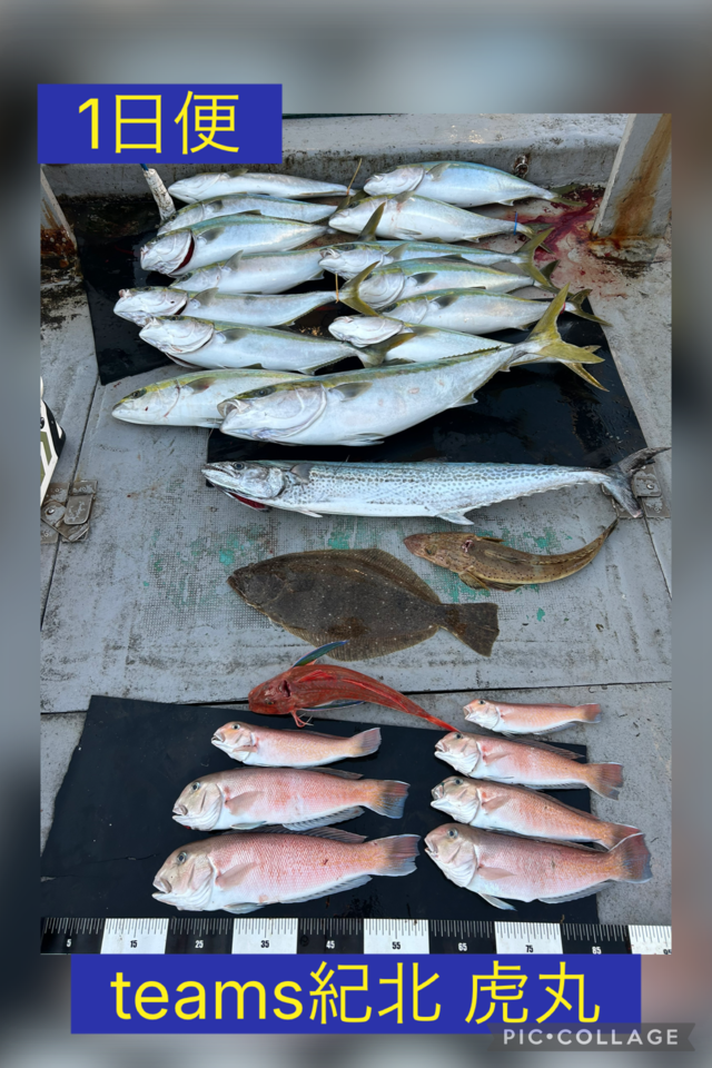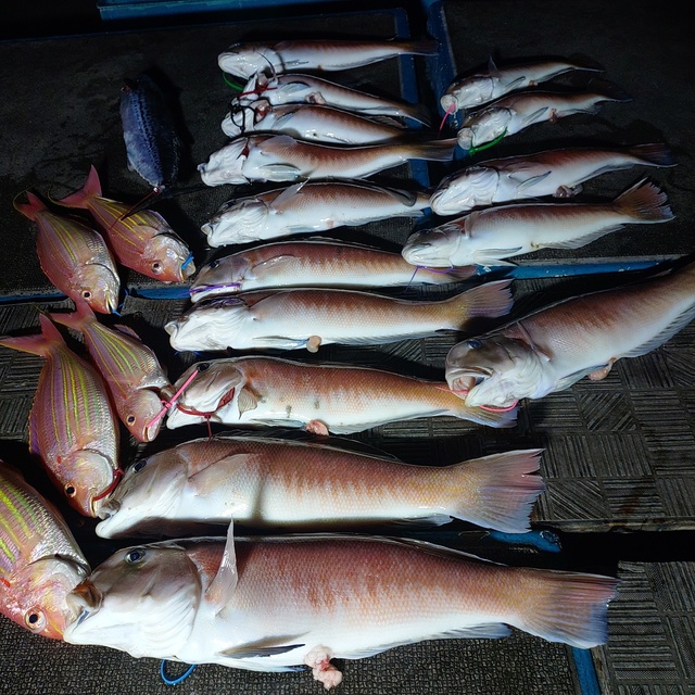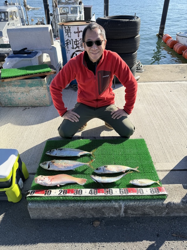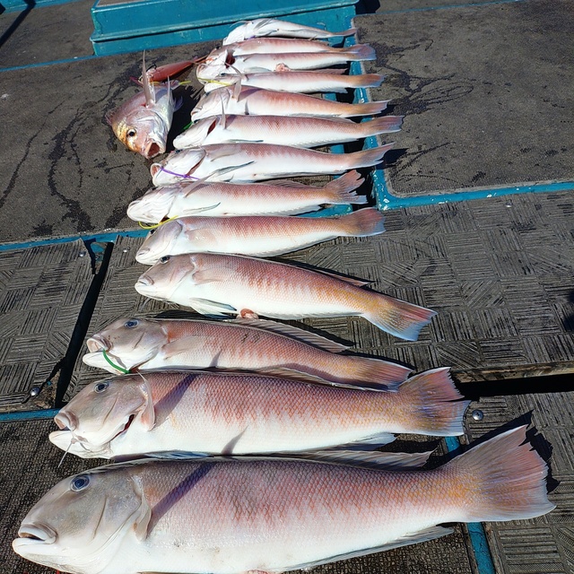 25~43cm 合計7匹 ブリ 90cm 合計1匹 メジロ 68~75cm 合計13匹 サワラ 100cm 合計1匹 ホウボウ 41cm 合計1匹 ヒラメ 55cm 合計1匹 イネゴチ 51cm 合計1匹 本日青物は前半は渋々でしたが後半はノマセで入れ食い。アマダイは当たり少なく苦戦しました。全員安打出来ませんでしたが全員お土産ができて良かったです。ありがとうございました。また宜しくお願いします。