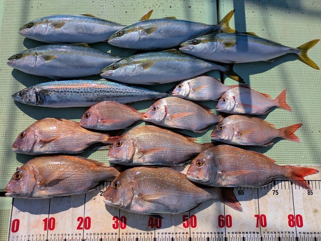 (サワラ)59cm 合計1匹 タイ 27~44cm 合計7匹 チダイ 25~31cm 合計3匹 ハマチ 46~49cm 合計5匹 釣行当日の潮汐