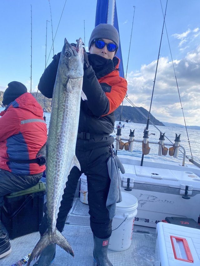87cm 合計1匹 サゴシ(サワラ) 56cm 合計1匹 マダイ 35~52cm 1~1匹 イサキ 43cm 合計1匹 ☆きょうは穏やかな凪の日和になりました。あと2週間ほどでお正月とは信じられなくくらいの陽気です。 ★今朝は上り潮からのスタートです。朝マズメにイサキを釣ってくらましたが、それから長いあいだ我慢の釣りになりました。 ☆天気はいいのに魚影も現れません。それでも突然チャンスはやってきて見事な良型マダイを釣っていただくことができました。 ★その後もまた我慢の釣りが続きました。そしてら魚影もないところで再びチャンスがやってきて今度はサワラを釣っていただくことができました。 ☆本日はどうもありがとうございました。 ★ところで明日は南風の予報です。もうじゅうぶん冬の季節なんですけどね。