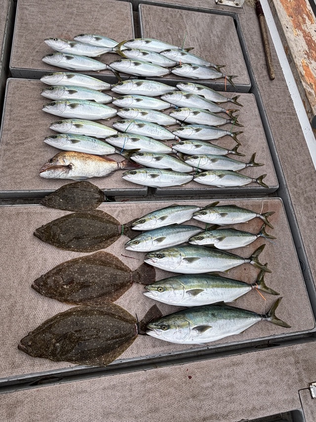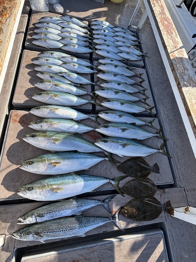 ヒラメ ブリ マダイ マゴチ 70cmオーバーの座布団ヒラメにブリ、サワラに真鯛に巨大マゴチなど、 色んな魚が釣れまくり!! ここに来てヒラメが巨大化してきています!! ぜひこのチャンスをお見逃しなく! 皆さん大変お疲れ様でしたー!!