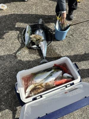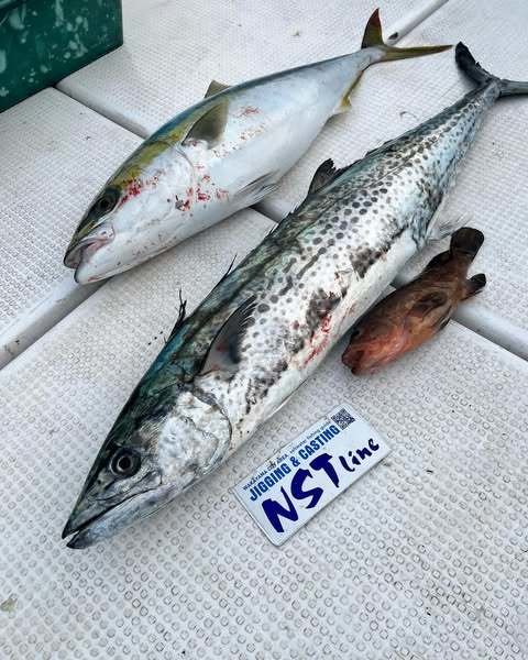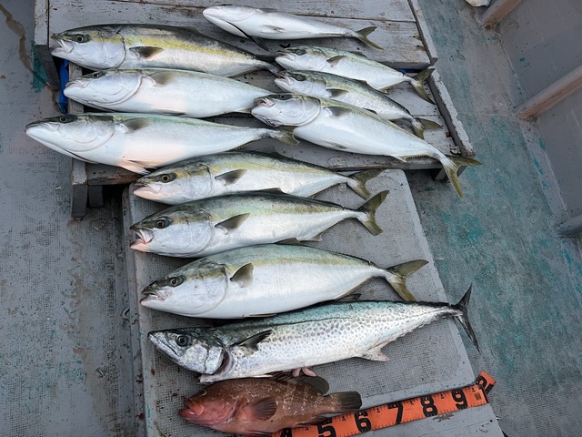82~85cm 合計2匹 サゴシ(サワラ) 53~55cm 合計5匹 メジロ 68~73cm 合計7匹 ツバス 45~45cm 合計2匹 シロアマダイ 26~28cm 合計2匹 本日青物スタートで活性高くジグでもノマセでもよくかかりましたがオマツリとラインブレイクでバラシ多数でしたがお土産分釣れて良かったです。後半の青物は潮緩く撃沈。アマダイは潮動かず撃沈。全員安打出来ずすいませんでした。またリベンジお待ちしてます。ありがとうございました。