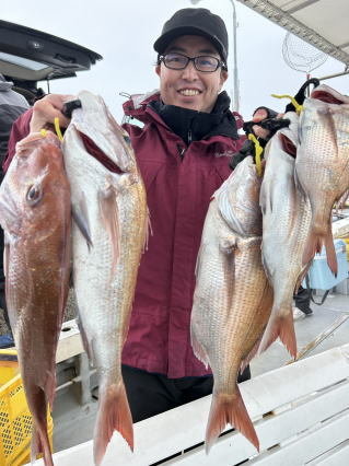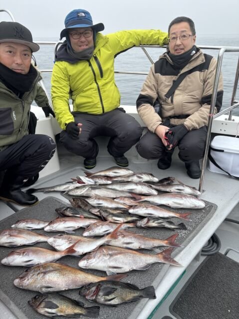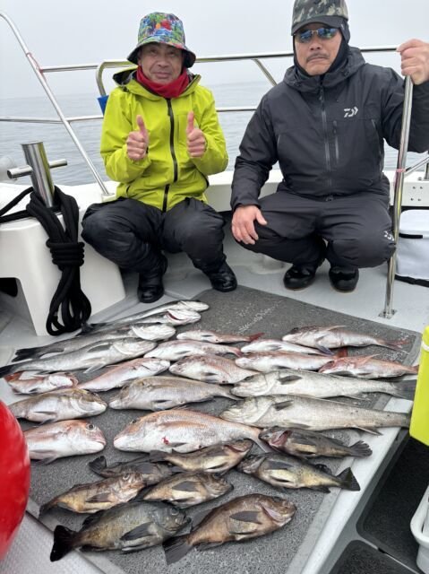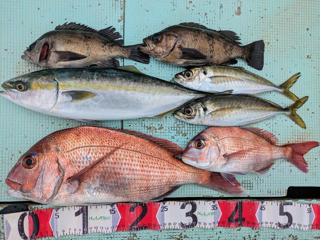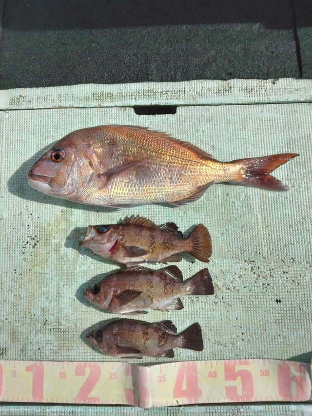 28cm 0~1匹 マダイ 30~51cm 合計5匹 ガシラ 23~28cm 合計9匹 6名様タイサビキで桜鯛釣りでした 結果6名中4名様にマダイがあたりましたほか1名様バラしたのが残念です 竿頭はマダイ51cm・30cmの2匹とガシラ2匹のかたでした。 朝一ポイント到着ひと流し目で、すぐマダイ41cmが釣れましたが、その後沈黙の時間が・・・。 ポイント移動後にマダイ3匹、お一人バラシ1匹あり残念です。、その後、ぼちぼちとガシラにメバルも追加いただき、全員に何かしら釣ってもらえました。本日のご利用ありがとうございました。