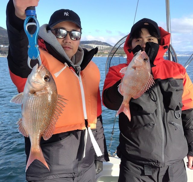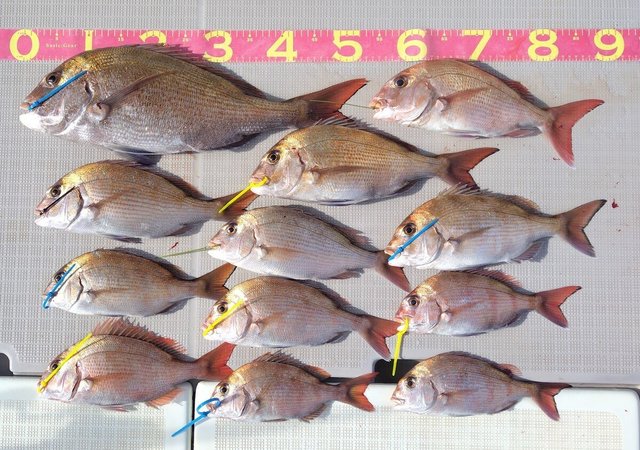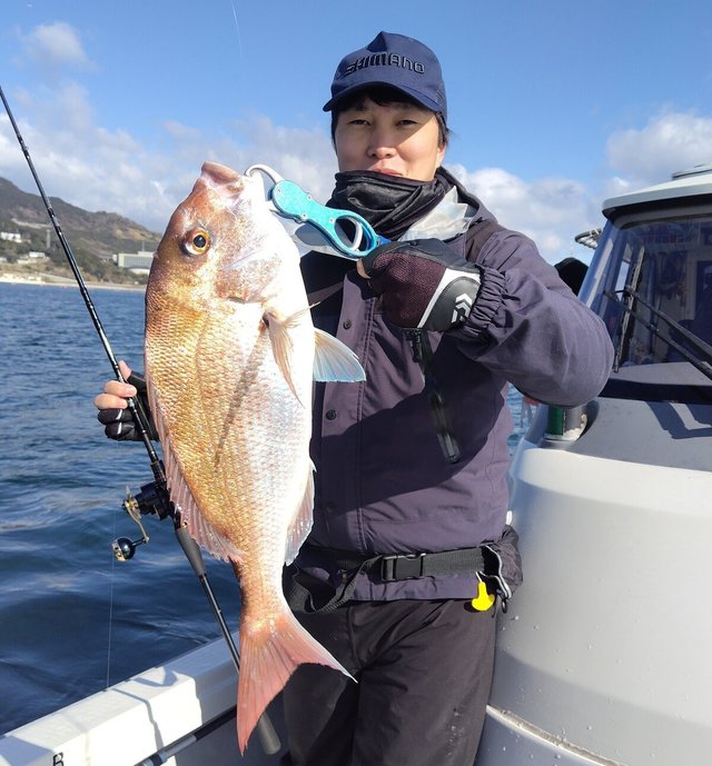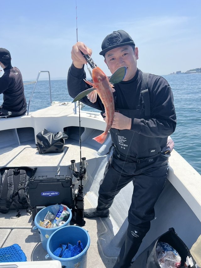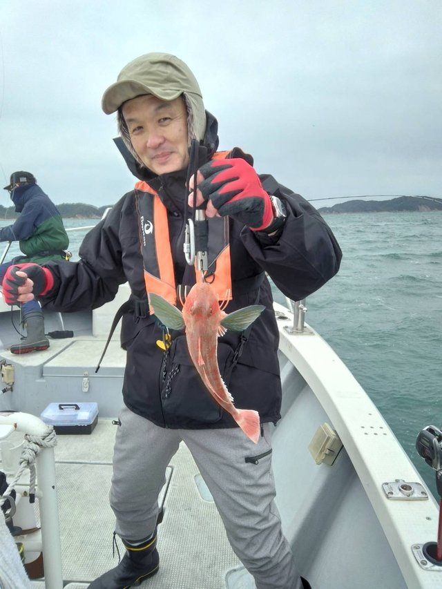 41cm マダイ 34~45cm 0~3匹 ワニゴチ 39~40cm 0~2匹 本日もロング便でタイラバ(^o^) 少し強めの波風でしたが、ドテラで頑張って頂きました! 朝一はホウボウからのスタートでしたが、本命1枚と後が続きません。 中盤はショートバイトは増えましたが、なかなかフッキングせずの展開で2枚の追加。 少し早めにポイントを移動したのですが、やっとアタリが増えてのプチ時合い。 多い人で3連発! 何とか格好がついた形となりました(^_^;) 本日も長時間の釣行、本当にありがとうございました。 ※チャリコのリリース、いつもありがとうございます。 m(__)m