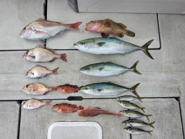 ブリ アカヤガラ サワラ マハタ アオハタ カサゴ アジ マダイ ニベ ヒラマサ カマスサワラ 本日は何でもコースでした。朝から波高く大苦戦でした。終盤ポロポロ食いました。本日のお客様頑張って頂き誠に有難うございます。今日釣れてくれた魚達ありがとう。