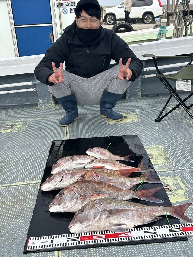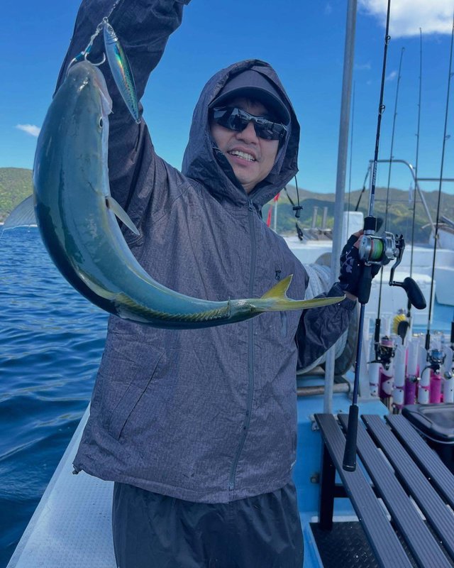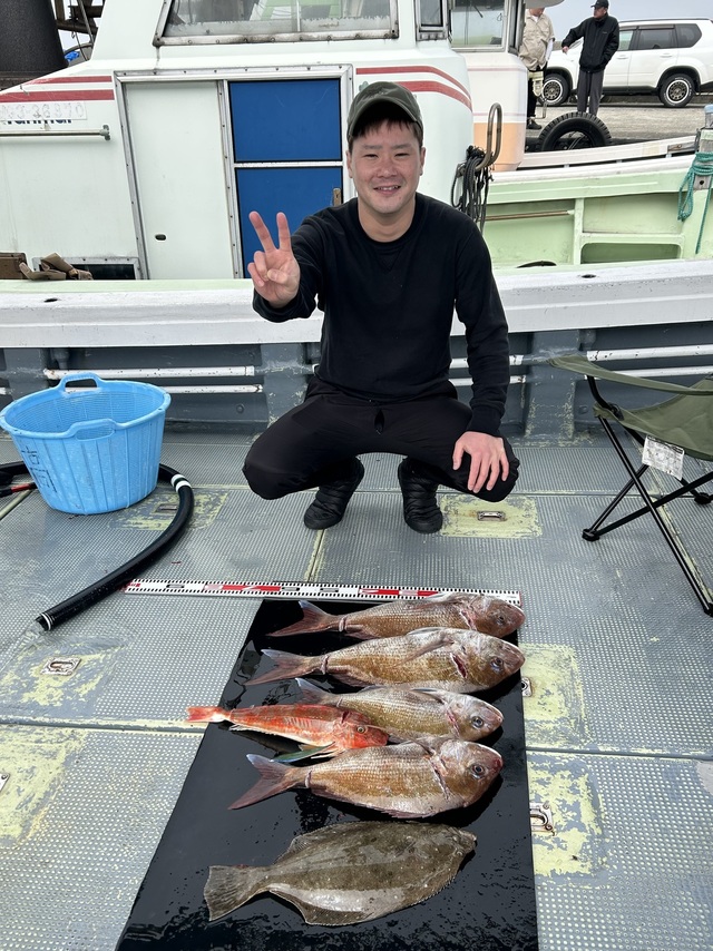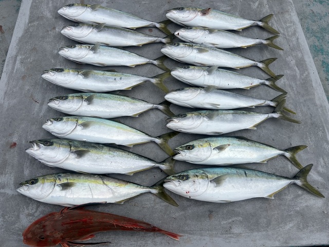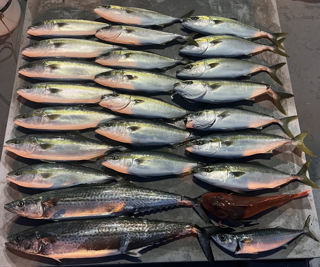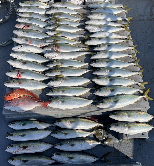 41cm 合計1匹 ブリ 90cm 合計1匹 メジロ 68~75cm 合計13匹 サワラ 100cm 合計1匹 シロアマダイ 25~43cm 合計7匹 ヒラメ 55cm 合計1匹 イネゴチ 51cm 合計1匹 本日青物は前半は渋々でしたが後半はノマセで入れ食い。アマダイは当たり少なく苦戦しました。全員安打出来ませんでしたが全員お土産ができて良かったです。ありがとうございました。また宜しくお願いします。