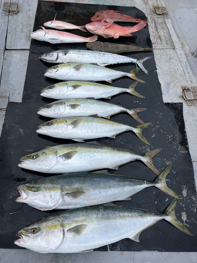 サワラ マダイ ブリ 本日は何でもコースでした。うねり中々ありましたが、みなさん頑張って頂きました。大きなマグロ掛かりましたがラインブレイクしてジグぶら下げたまま水面まで浮いて来てさようならでました。本日のお客様頑張って頂き誠に有難うございます。今日釣れてくれた魚達ありがとう。