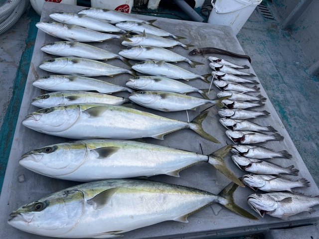 (マアナゴ)58cm 合計1匹 ブリ 87~92cm 合計3匹 クログチ 32~45cm 合計13匹 ハマチ 43~52cm 合計13匹 青物&クログチでした。 クログチは序盤かなり苦戦でした。 餌取られたりポロッと釣れたりするものの ほとんど当たりなくウロウロしました。 何とか時合いが来たらパタパタとヒットありでした。 青物はまずはハマチ狙いで ボコボコヒットありでしたが これも続かずすぐに終了。 良型狙いは着いてすぐ 次々と連続ヒット! フックアウトもありましたが これもまたまた続かずで 時合いの拾い釣りって感じでした。 上手く合わせて釣って頂き 苦戦ながらも見事全員安打でした。 本日はありがとうございました! またお待ちしております!