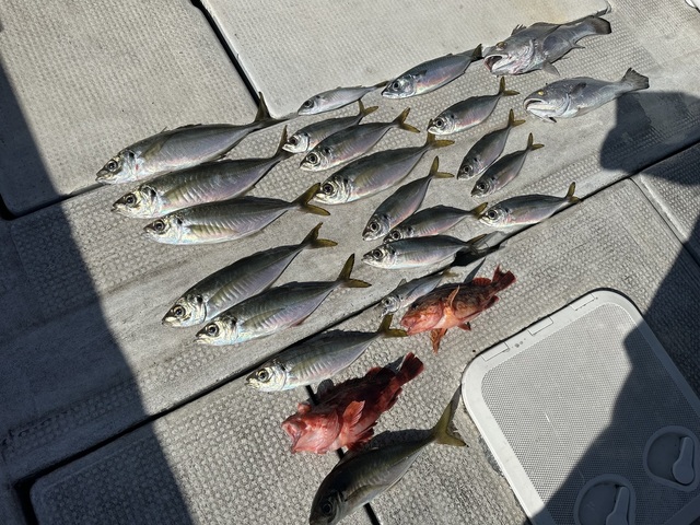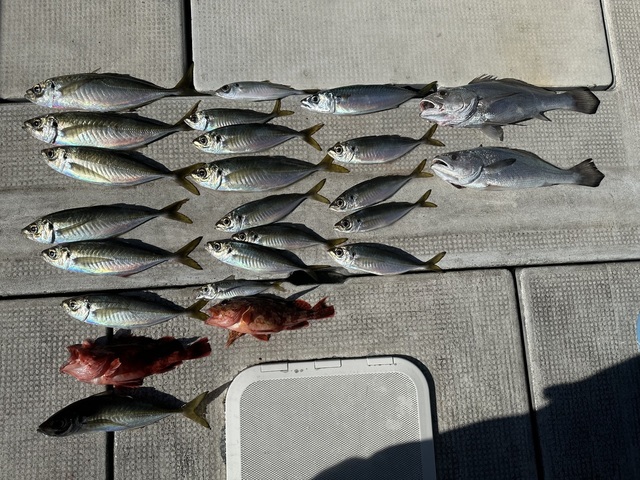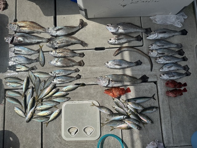 (マアナゴ)80cm 合計1匹 メジロ 70cm 合計1匹 アジ 23~33cm 3~10匹 ガシラ 22~25cm 1~2匹 本日は クログチアジ五目にお越しいただきありがとうございます。 前日からのウネリが残り、とても釣りにくく、狙いのクログチは厳しかったです。アジはバラシ多数有りましたが、お土産として持ち帰って頂けて良かったです。 次回リベンジお待ちしております。 船長
