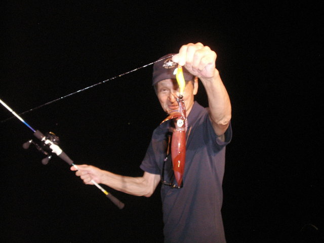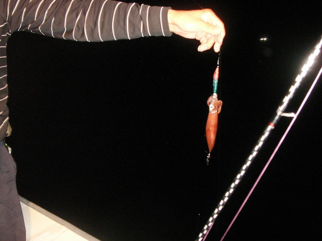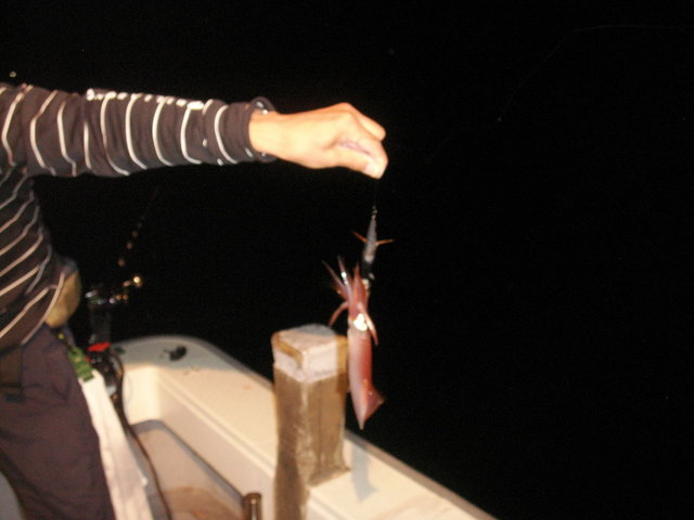 (ケンサキイカ)13~28cm 10~23匹 今晩から出ました。今晩はやり出しからゆるい上りで、パラパラっとアタリましたが、潮止まってしまいさっぱりアタらなくなり、ちょっとしてからゆるい下りが動き出し、ほんのポツポツアタリで、いい釣果になりませんでした。盆過ぎてから、水温は27度台から28度くらいありましたが、今日は24度前後と下がり過ぎていました。この低い潮が、悪いように思います。