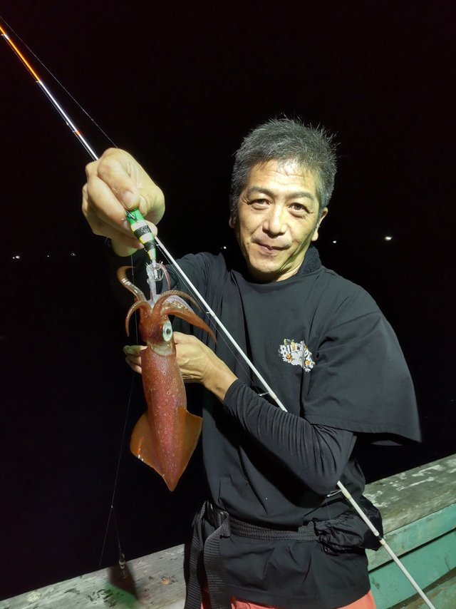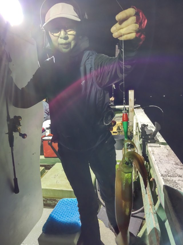 (ケンサキイカ)スルメ ちょっと風あったので涼しかったです。 スルメしか多かったです。 そのスルメも釣りにくいです。 トップは胴突き仕掛けの23匹でした。 イカメタルは14匹でした。