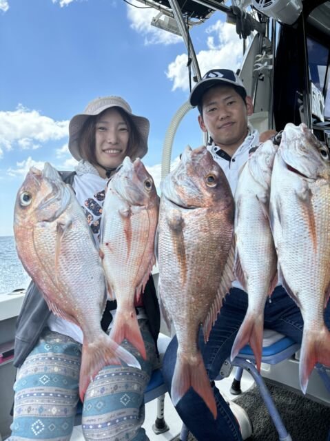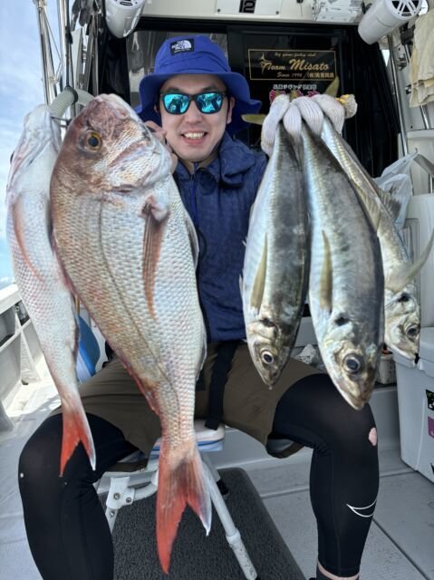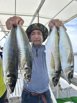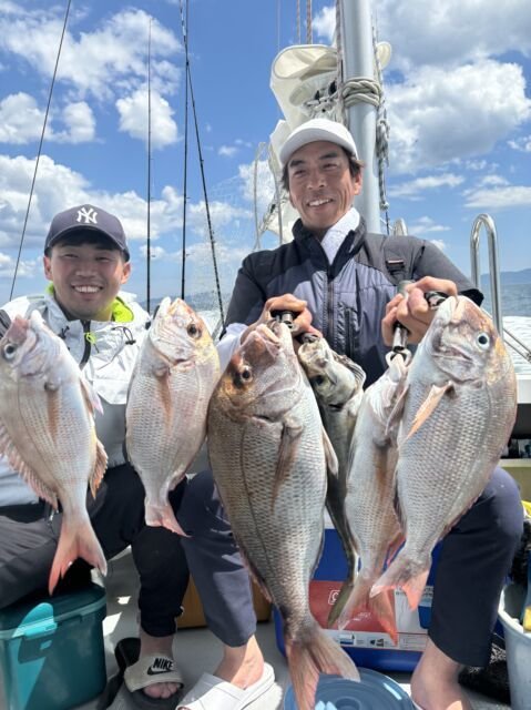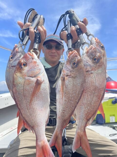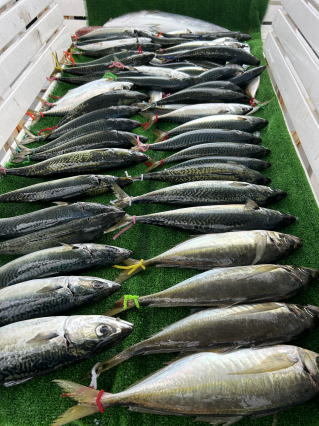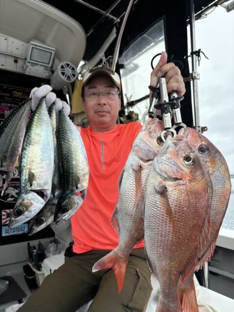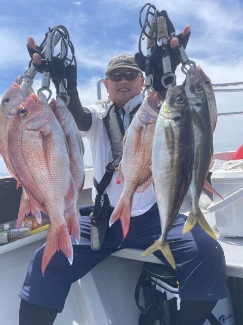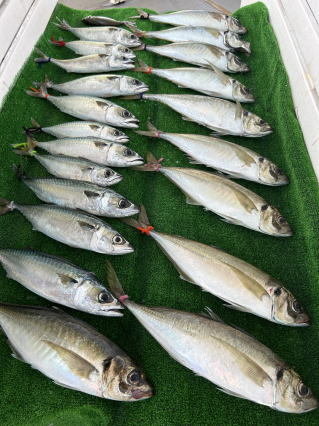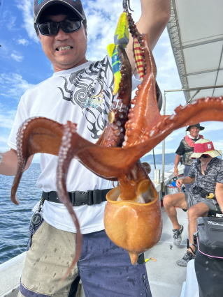 マダイ 38~56cm 竿頭2匹 マダコ 0.30~1.30kg 竿頭10匹 ヒラアジ イサキ サバ アジ、平アジ22~46㎝~32匹。お疲れさまでした(^-^) 引き続きサビキで鯛。鰺&真ダコ狙いでの二本立て 海の中も熱くなってきましたね(^O^)/ 潮の流れ出しには青物ハマチが爆発、鯛チョクリでは ハリス3号以上でなければプチプチとハリス切れ(>_<) 鯛ハマチにイサギ鬼アジと(*^^)v何とか顔が見れて 平アジ狙いにポイント移動 平アジ潮時も良く皆さん二桁釣果で最後に真蛸狙い 真蛸は爆釣りではないものの、お土産確保で帰り舟となりました(*^^)v 鯛サビキ五目狙い、タコエギ、チャレンジお待ちしています(^O^)