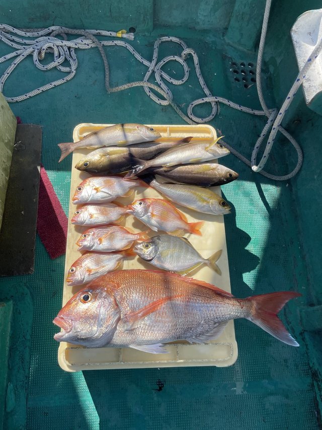 (ロウニンアジ)マダイ 30~70cm 合計25匹 チダイ レンコダイ チカメキントキ サバ イサギ ヒラソーダ ハマチ 今日も色々釣れました。1番デカい真鯛は70センチ。 アタリ多かったです。 潮もまあまあ流れてました。