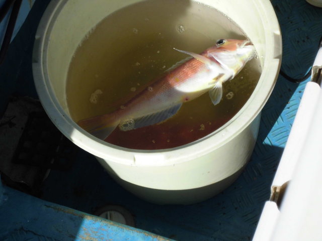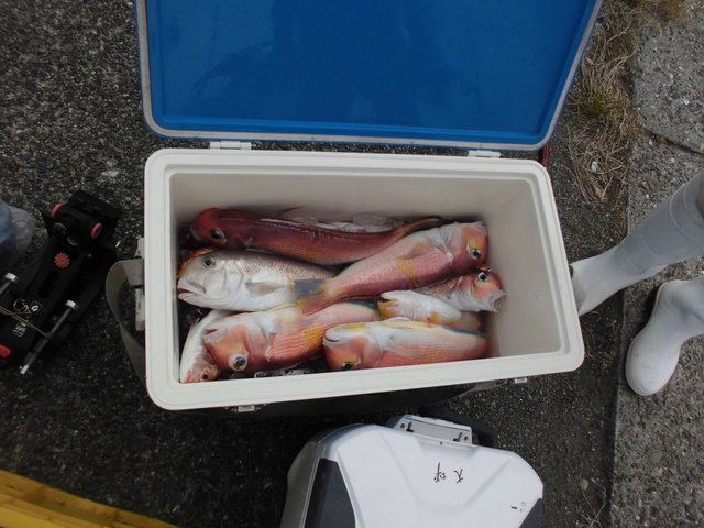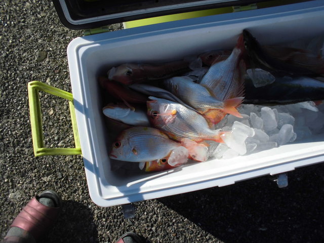 サワラ アオハタ メバル レンコ アマダイ 朝は近場で肩ならし。 レンコ、サワラ、ウッカリ拾って遠くへ。 実績あるから余裕だろうと思ってると潮止まり。 地獄モードにハマり3時間はレンコも釣れない。 点々と探りながら帰ってるとサワラ、甘鯛、レンコ、青ハタ急に釣れ出してサービス残業して 帰りました。 見習い船長君は3位かな。皆んなのクーラー撮影と言ったのにやる気のない写真1枚。 いつもは並べて撮るのに。数でも型でも負けてふざけた写真。 今日も遠くからありがとうございました。