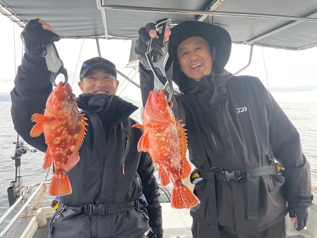 (キジハタ)50cm 合計1匹 マダイ 30~50cm 0~2匹 本日は朝から風波共に穏やか♪でしたがアタリが殆どなく嫌な予感…辛抱出来ず移動開始しましたがそこから後手になってしまい厳しい釣行となってしまいました。すみません(>人<;) 更に波風も上がり結果撃沈です。 そんな中、田邊さん前回に引き続きビッグアコウ!森さん50真鯛!安藤さん49.5cmうまく釣り上げてくれてました。写真はいつも通り全ては撮ってません。本日のご乗船ありがとうございました。