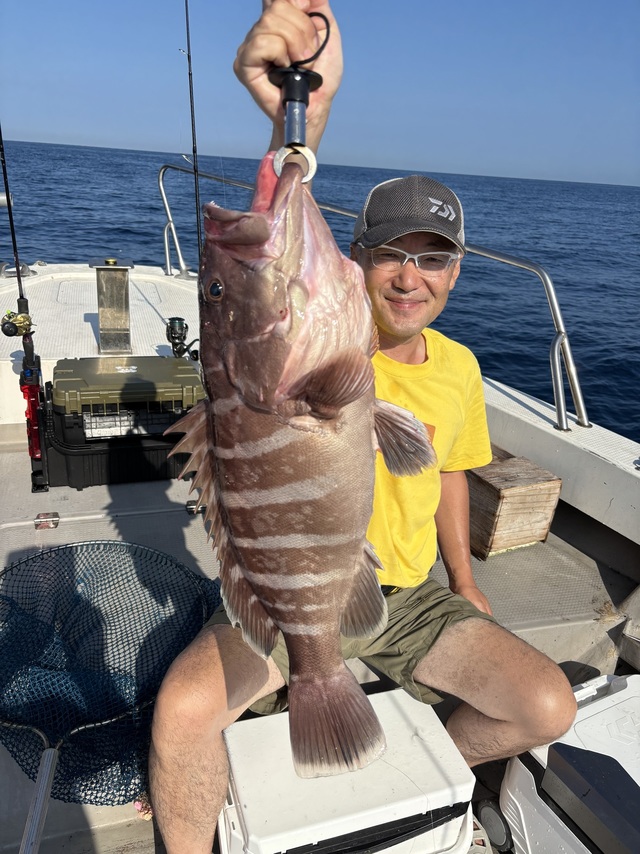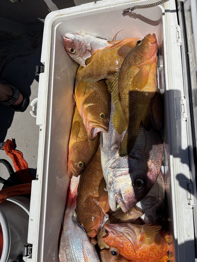 40~70cm 1~5匹 沖ノ島絶好調!!!今日も朝から4キロクラスの大鯛に7キロ、6キロ、5キロのタカバも上がりました。アマダイも釣る人6匹全体では20枚前後上がり今日は釣る人大型クーラー満タンになりました。ちなみに画像のクーラーはお一人様分です。真夏の大鯛に大型底物釣り如何でしょうか。24日木曜日空いていますので、よろしくお願いします。