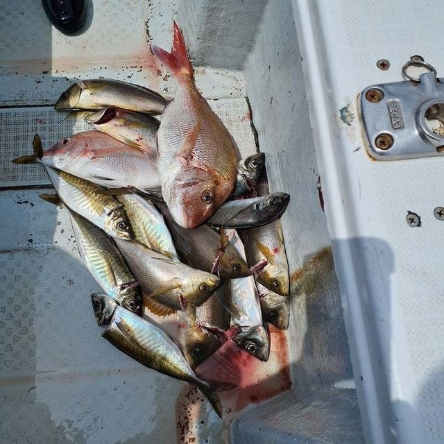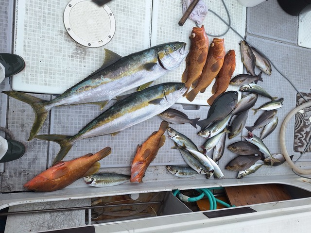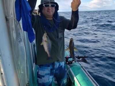 マダイ オオモンハタ アコウ 長崎県フリーダムさんからLJ&SLJにGO! 前半はタイラバに混じってブレードジグでマダイ狙い、後半はプレシーズンのSLJイサキでした! 前半のマダイはブレードジグへの反応も抜群で、マダイ入れ食い状態! 早巻きでも、下から30mでもお構いなしのバイトの嵐でした! サイズも良く、早巻きからのガツンは最高ですね! 後半のSLJではドテラ側へのフルキャストからのジャカ巻き→フォールでイサキを攻略! あのフォール中の硬いアタリはたまりません! 本格シーズンイン前との船長の情報ですが、個人的にはもはやベストシーズン! だってフロントとリアにイサキダブルなんてのもあるんだものw ゲストのオオモンハタやアコウもサイズ良く、最高の一日でした!