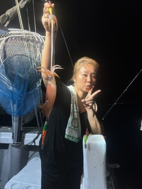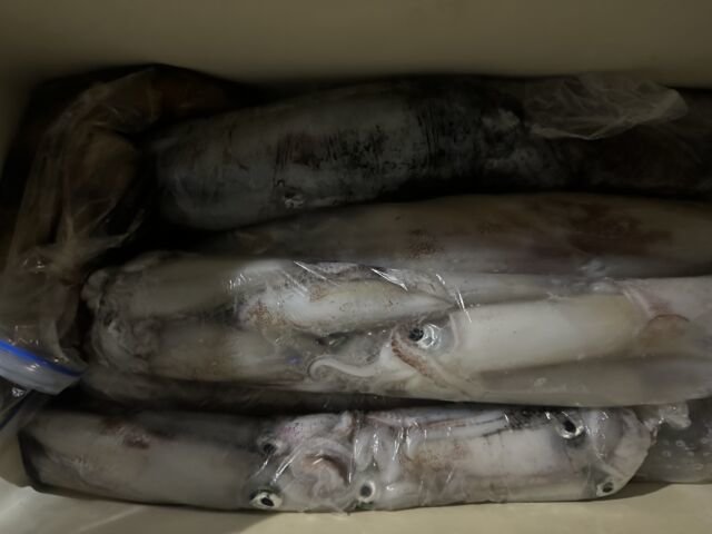 (ケンサキイカ)本日もイカ釣りで出船しました! しかし、最近の好調とは打って変わって、今日は我慢の展開となりました。 なかなかイカからの反応が得られず、数は伸び悩み…。 ただ、釣れてくるイカは良型が多く、その点は救いでした。 最終的な釣果は10杯前後と、少し悔しい結果です。
